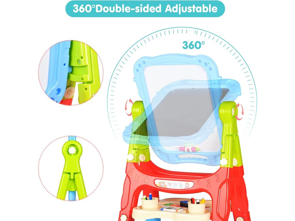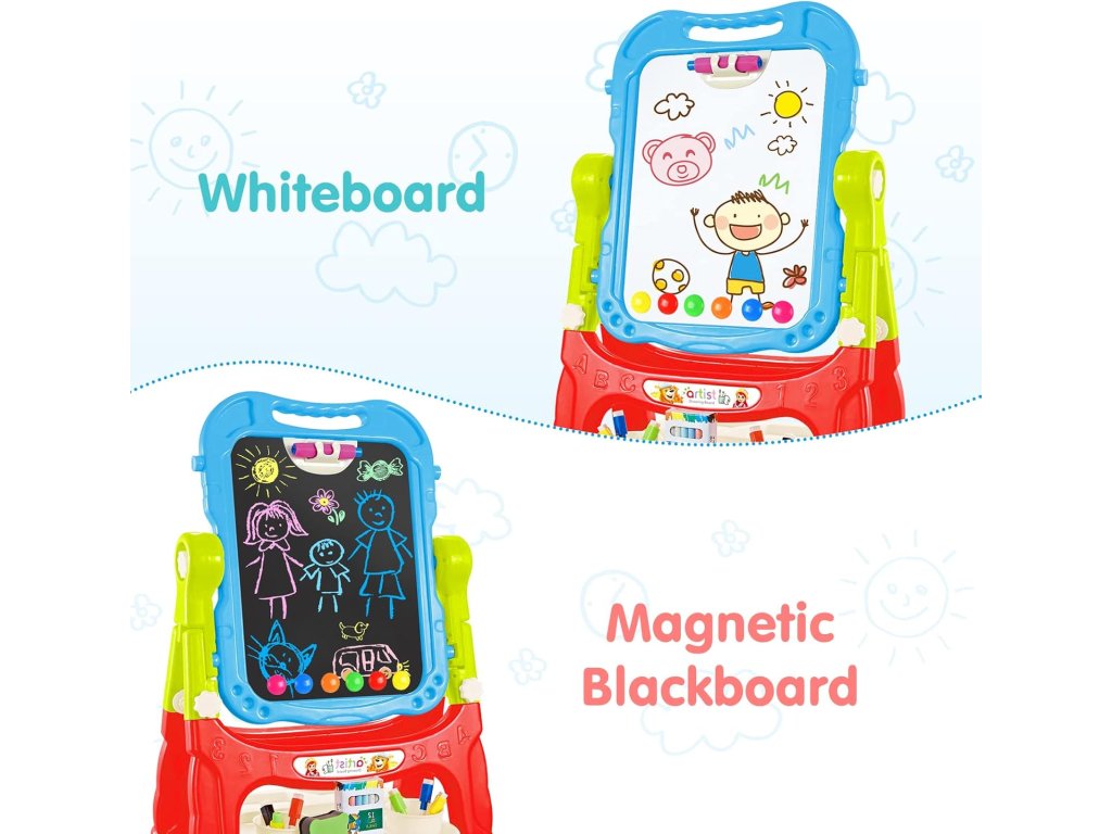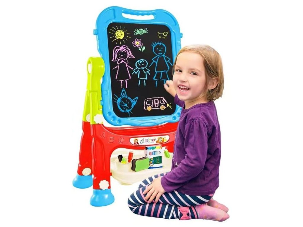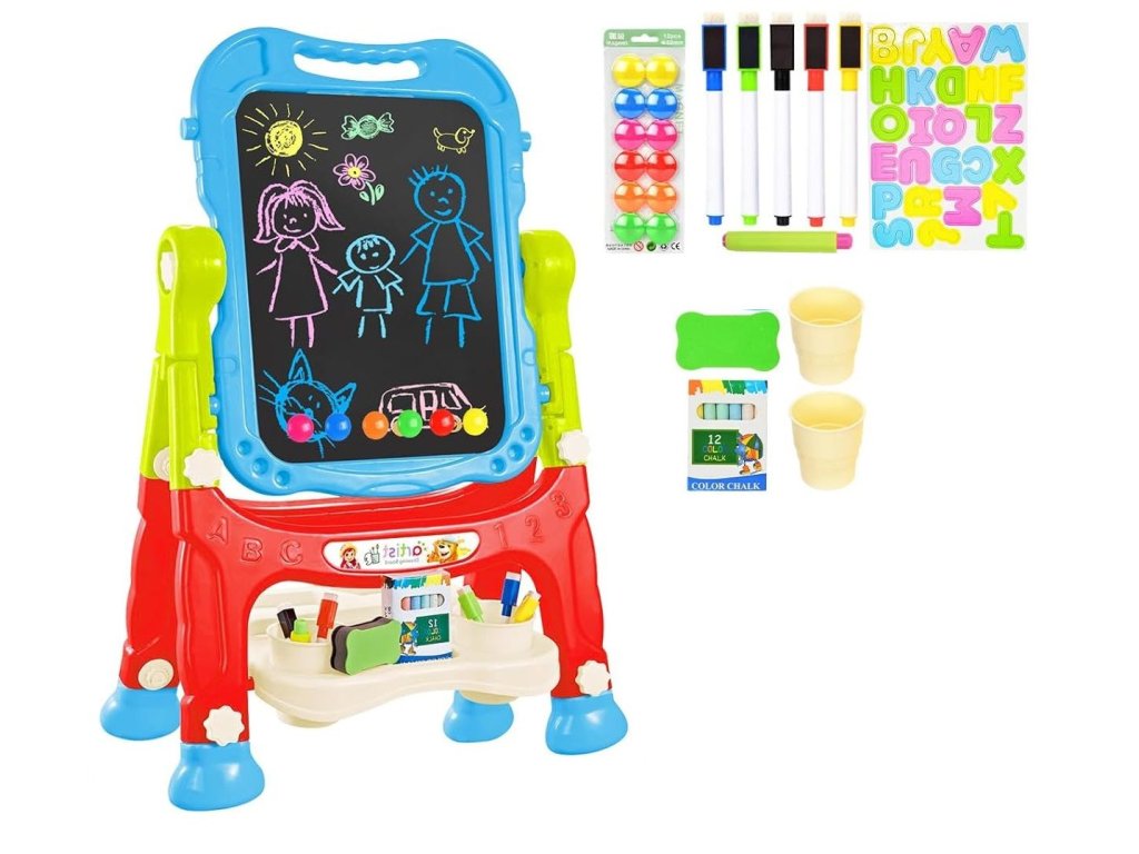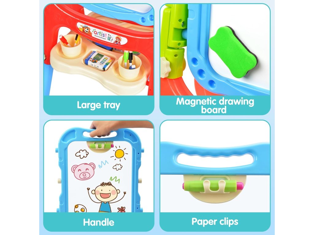 Má na jedné straně tabuli pro psaní křídou a na druhé straně je vybaven magnetickou tabulí pro mazání za sucha. Bílá tabule umožňuje malování akvarelem, zatímco černá tabule se dá použít k procvičování kaligrafie a učení. Díky magnetickým tyčinkám mohou děti pohodlně kreslit na řemeslný papír ve stojanu. Trojúhelníkový držák zvyšuje stabilitu rýsovací desky.
