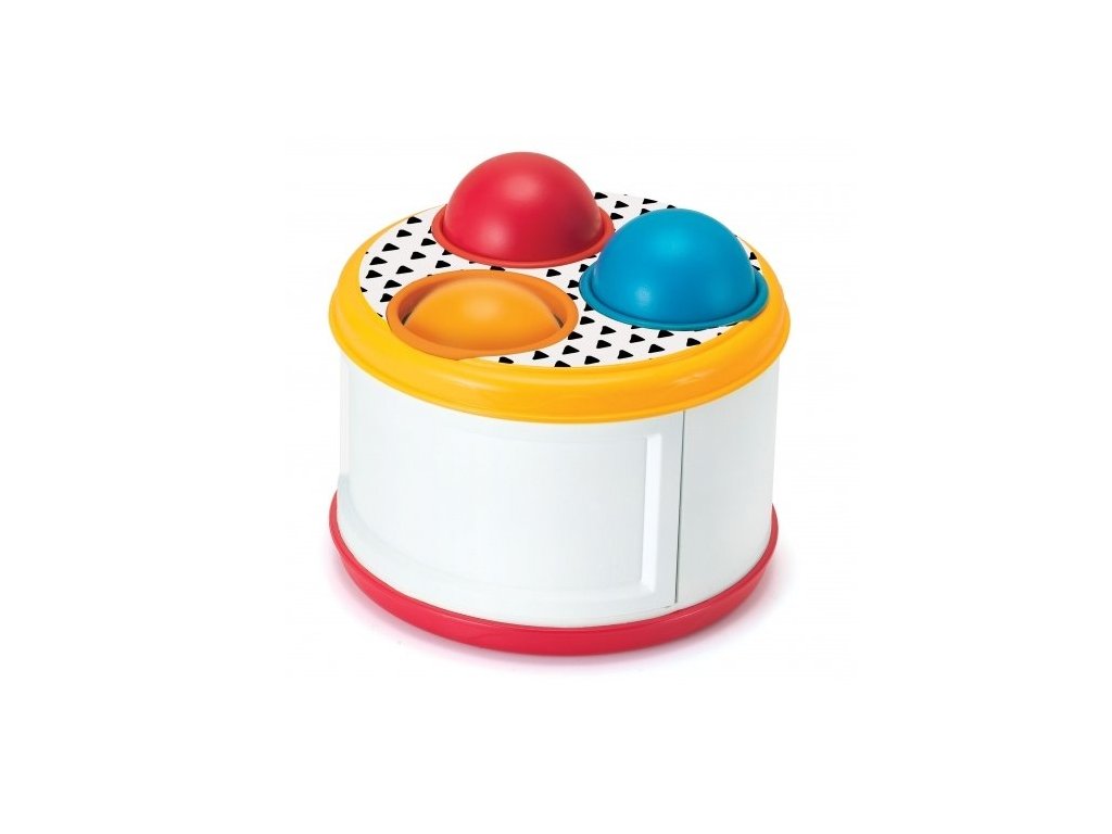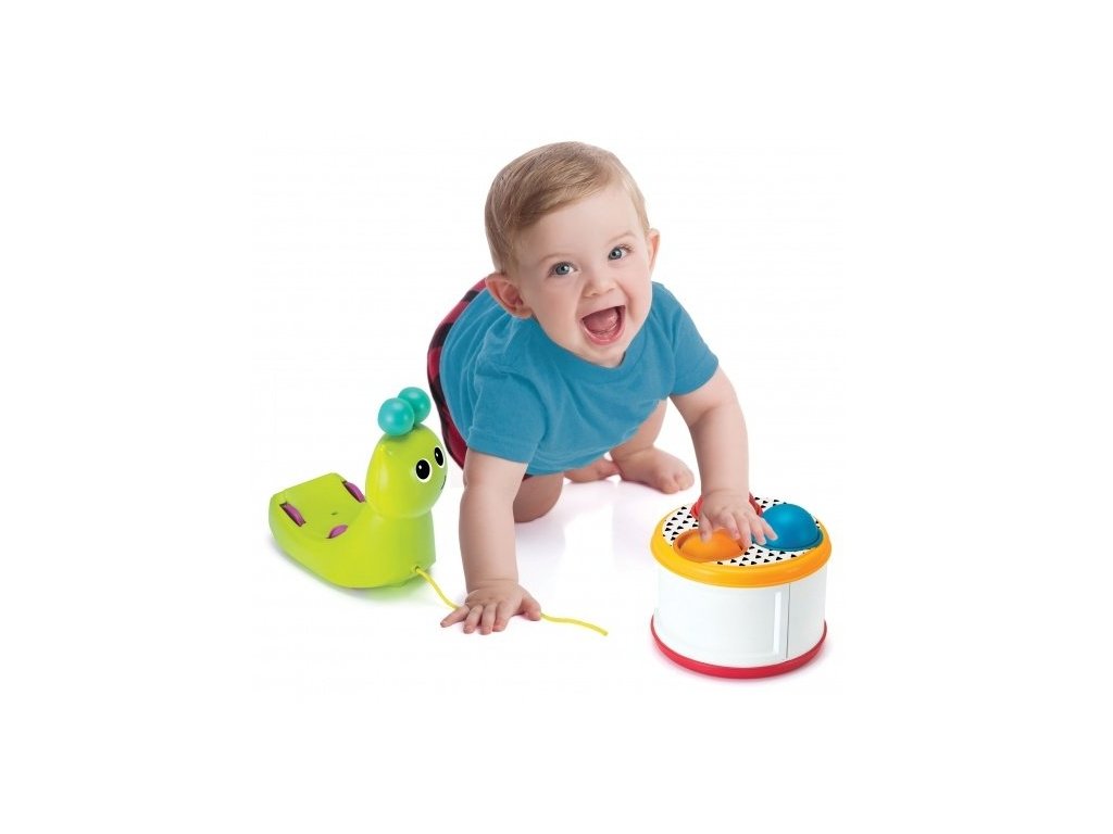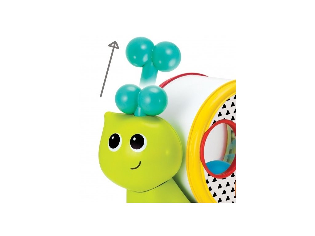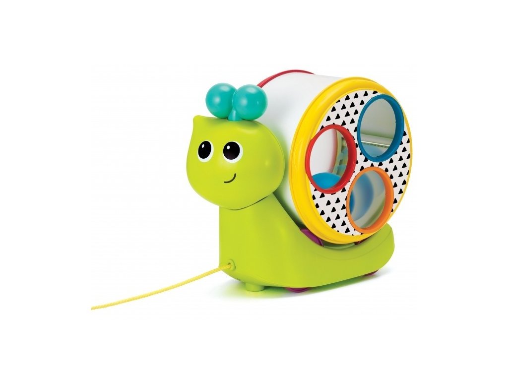 Tahací šnek na kolečkách má odnímatelnou ulitu ve tvaru hracího bubínku, naplněnou třemi míčky. Součástí je i palička na bubínek.