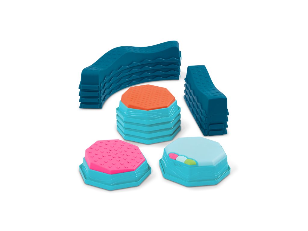 Variabilní překážková dráha Balance & Groove poskytne vašim dětem zábavu a zároveň pomáhá rozvíjet jejich rovnováhu, koordinaci a hrubou motoriku. Součástí sady je speciální hudební stupínek s LED světelnými efekty, který dodává celé dráze magický efekt a motivuje děti zkoušet další a další herní varianty. Sada nabízí mnoho kombinací a způsobů použití, takže pokaždé můžete vymyslet novou, zajímavou variantu. Každý kulatý stupínek navíc nabízí jinou texturu na horní barevné straně.Modulární balanční dráha – 4 vlnité překážky, 4 rovné překážky a 5 senzorických stupínků umožňují nekonečné kombinace a variabilní stavbyHudební stupínek s LED světelnými efekty – speciální díl, který hraje a svítí a nabízí tři zábavné hryPodpora motorického rozvoje – chůze po dráze posiluje rovnováhu, koordinaci a jistotu pohybuSenzorické zážitky – různé povrchy stupínků podporují hmatové vnímání a rozvoj smyslůJednotlivé díly se velmi snadno spojujíPro samostatnou i skupinovou hru – ideální pro děti, které si chtějí hrát samy, i pro společné aktivity s kamarády nebo sourozenciJednoduché skladování – všechny díly lze snadno stohovat a kompaktně uložitVhodné pro vnitřní i venkovní hraníSadu je možné kombinovat se samostatně prodávanou překážkovou dráhou Balance & Hop i sadou sadou překážek a stupínků Balance & Build.Baterie 4x AA (1,5V) jsou součástí.Vhodné pro děti od 3 let.Doplňkové parametry