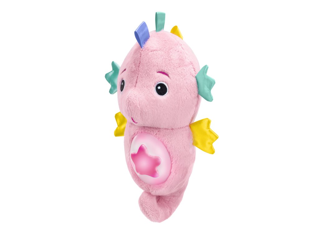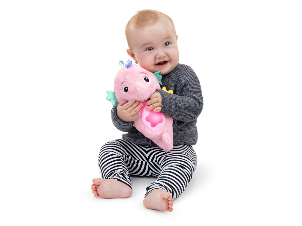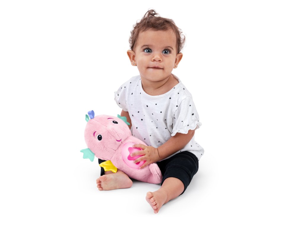 Díky technologii reakce na pláč reaguje mořský koník na pláč dítěte – automaticky spustí až 7 minut melodií nebo zvuků oceánu. Děťátko se může naučit samé uklidnit – stačí jemně zmáčknout hvězdičku na bříšku koníka, a ten zazáří jemnými barvami (až 5 odstínů) nebo přehraje až 15 minut klasické hudby či přírodních zvuků. Na bříšku se nachází i držák na dudlík, aby měl drobeček svůj oblíbený dudlík vždy po ruce. Navíc má koník pestrobarevné stužky, které stimulují hmat a zrak miminka. Ideální dárek pro děti již od narození. Perfektní tip na dárek k narození miminka.