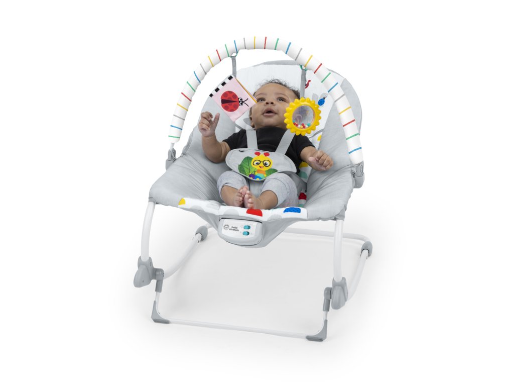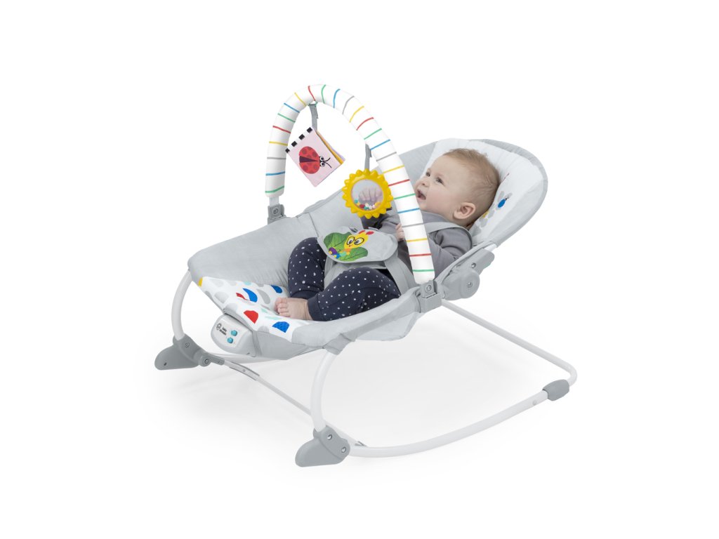 - 2 odnímatelné hračky (šustící knížka a chrastítko ve tvaru slunce) podporují senzorické objevování; odstraněním hrazdičky se změní na houpačku pro batole