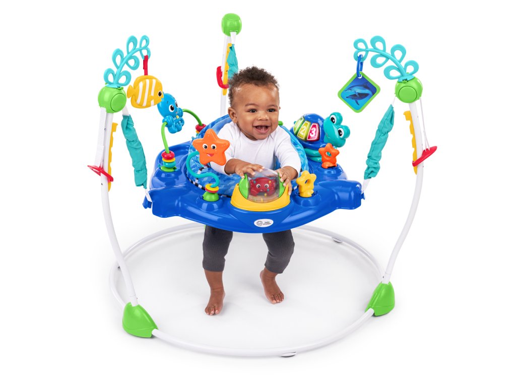 - Skákadlo má 4 nastavitelné výšky, které rostou s dítětem; Sedačka se otáčí o 360° a obklopuje dítě mořem učení a objevování; Rozměry: 86,4 × 93,2 × 93,2 cm.