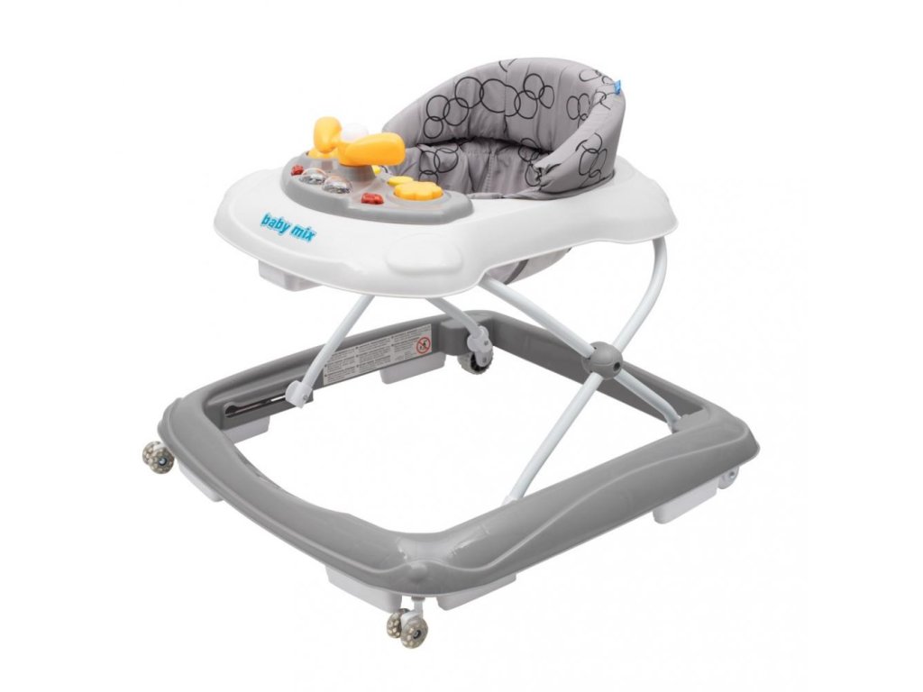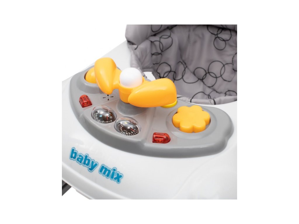Multimediální chodítko Baby Mix se silikonovými kolečky. Chodítko je vybaveno pohodlným ergonomicky tvarovaným sedadlem, které zajišťuje správné držení páteře. Multimediální panel obsahuje různé světelné efekty, troubící volant, kterým lze otáčet, tlačítka pro přehrávání melodií a dvě světla. Krásné chodítko s hračkami okouzlí malé objevitele a umožní jim hrát si ještě déle. Chodítko je vybaveno speciálním systémem proti převrácení, který zajistí Vašemu dítěti pohodlí a bezpečnost.