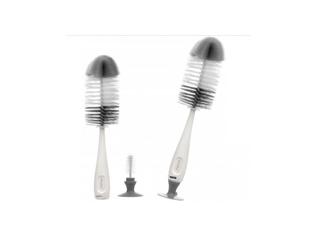 Kartáč na čištění lahví a saviček 2v1 s přísavkou je určen pro snadné čištění dětských lahví a saviček. Kartáč je složen ze 2 částí - uvnitř konce rukojeti velkého kartáče (určený na čištění vnitřku lahví) je umístěn menší kartáček (určený na čištění saviček).