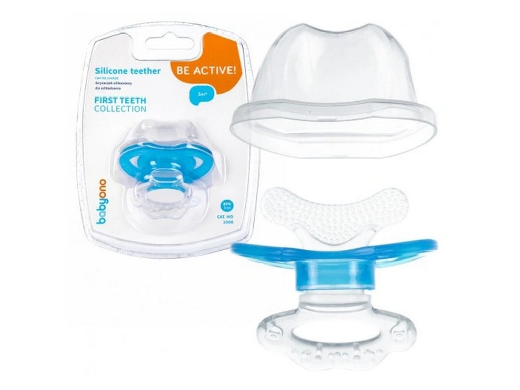 BABYONO Kousátko silikonové bez BPA ve tvaru dudlíku s krytem modrá 3m+