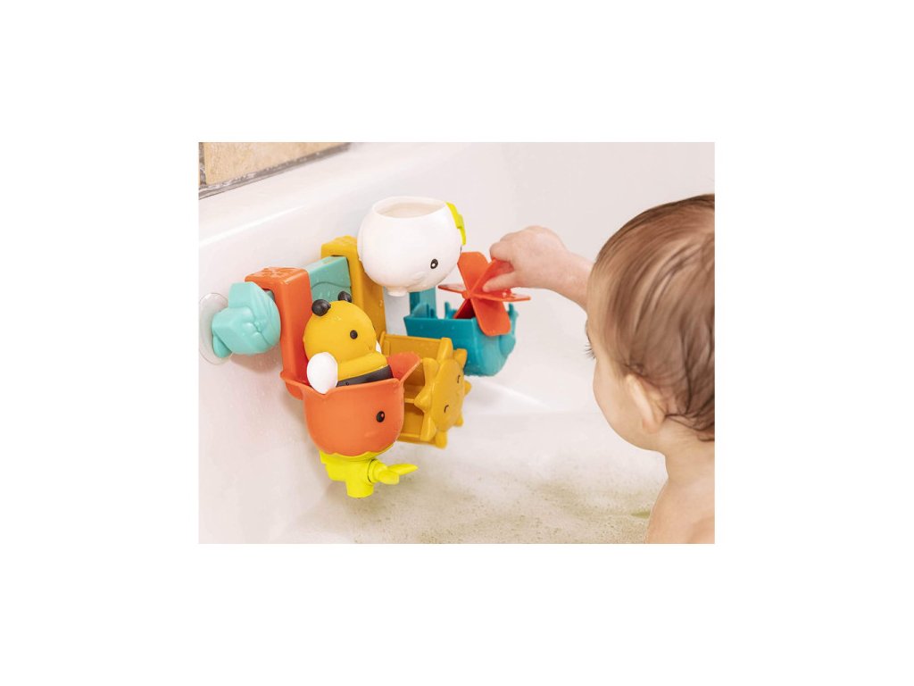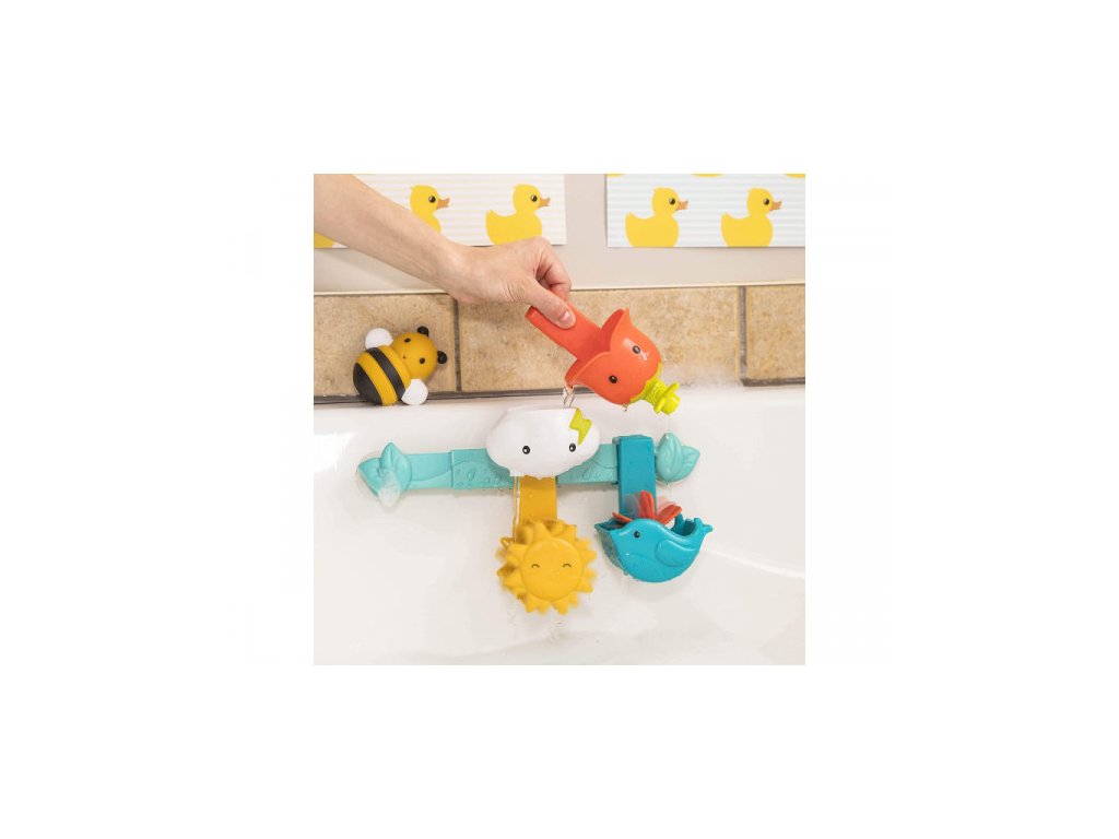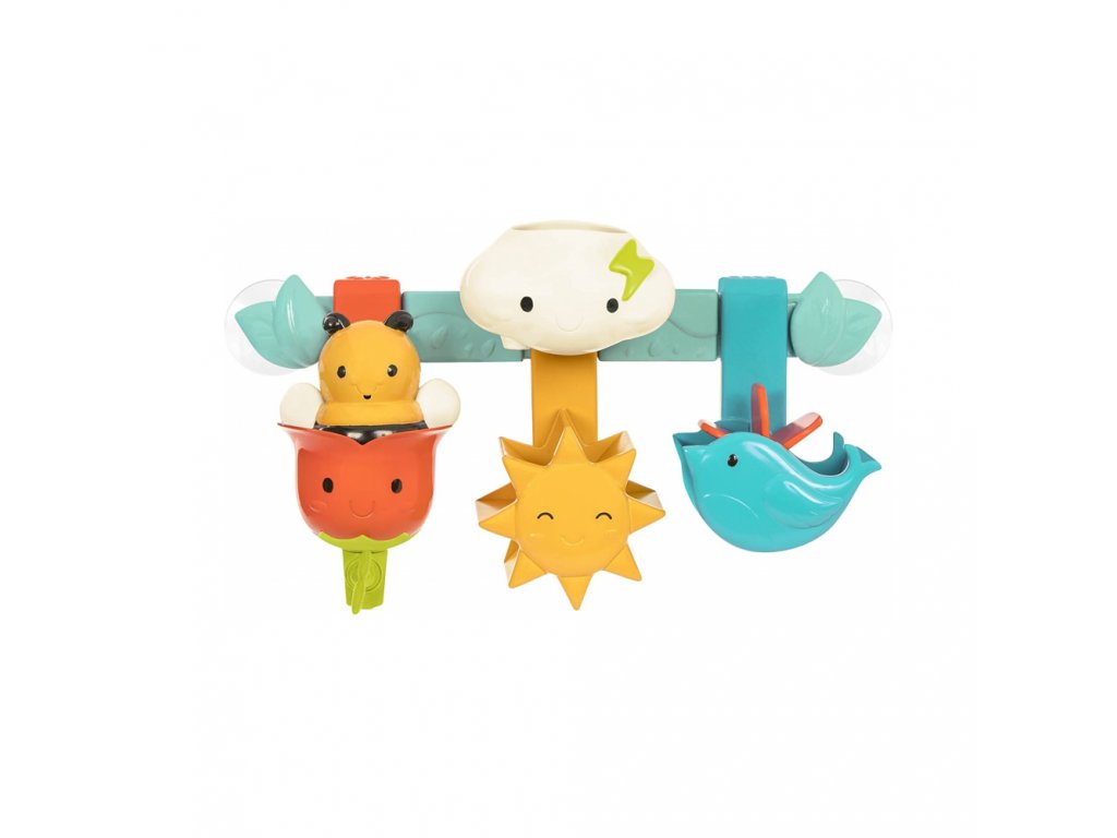Hrací pultík zajistí vašemu batoleti spoustu zábavy při koupání ve vaně. Hračku tvoří lišta s přísavkami a šest odnímatelných hraček pro hraní s vodou. Včelka stříká vodu a umí se posadit na květinu. Stonek květiny funguje jako kohoutek, kterým dítě pouští i zastavuje průtok vody. Voda protékající mráčkem roztočí sluníčko pod ním. Podobně se po nalití vody roztočí mlýnek vložený do kelímku ve tvaru ptáčka.