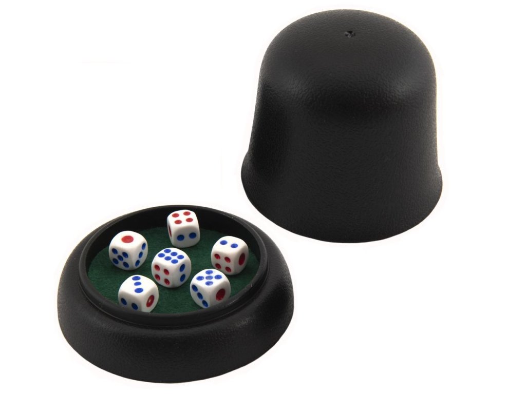 Hrací kostky s kalíškem. Oblíbená a jednoduchá hra s kostkami, kterou si vaše děti zamilují. Navíc se u toho naučí základní počty. Vhodné také na cesty.