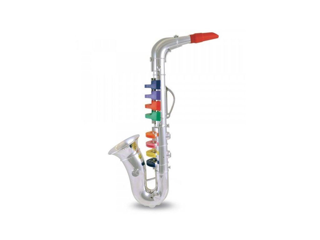 Saxofon stříbrný s 8 barevnými klapkami. Dechový. Velikost 43 cm.