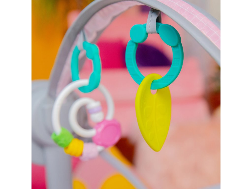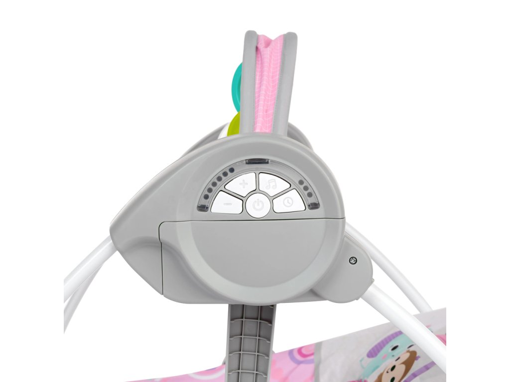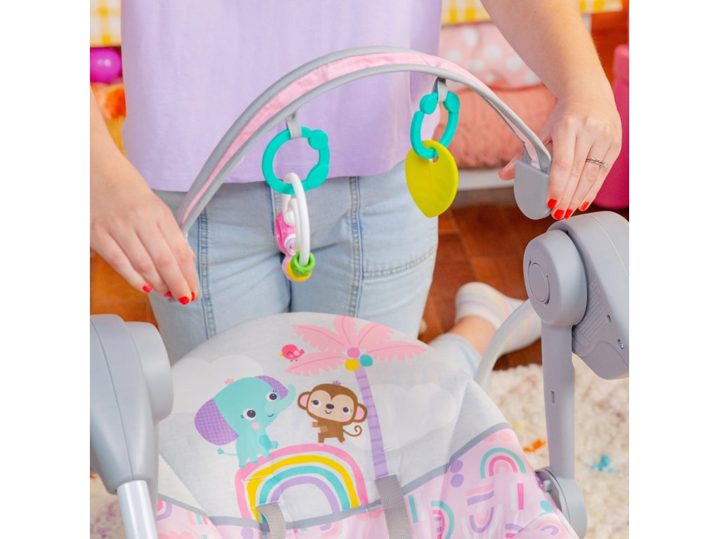 Dopřejte miminku dovolenkovou pohodu s přenosnou houpačkou Bright Starts Pink Paradise. Děťátko se bude klidně houpat v tomto pohodlném sedadle nebo si zábavně hrát s interaktivními hračkami. Můžete si být jisti, že dítě bude v bezpečí a na dohled. Díky 2 polohám sklopení bude houpačka vždy přizpůsobena preferencím vašeho dítěte. Dvě hračky inspirované přírodou, veselý duhový design a kamarádi slůně a opička udrží miminko v dobré společnosti a náladě. Odnímatelná hrazda s hračkami umožňuje snadný přístup k dítěti. S 10 veselými melodiemi je čas houpání zároveň časem písniček a nastavitelný 5-bodový bezpečnostní pás udrží miminko v hlubokém a pohodlném sedadle bezpečně připoutané. Lehký a skládací design umožňuje snadné přenášení nebo skladování. Houpačka je plná užitečných funkcí: technologie TrueSpeed umožňuje výběr z 6 rychlostí houpání, které se přizpůsobí rostoucímu dítěti. Technologie WhisperQuiet zaručí, že jediný zvuk bude šťastné mumlání vašeho děťátka. Houpání a přehrávání melodií funguje na 4 baterie typu C (nejsou součástí balení).