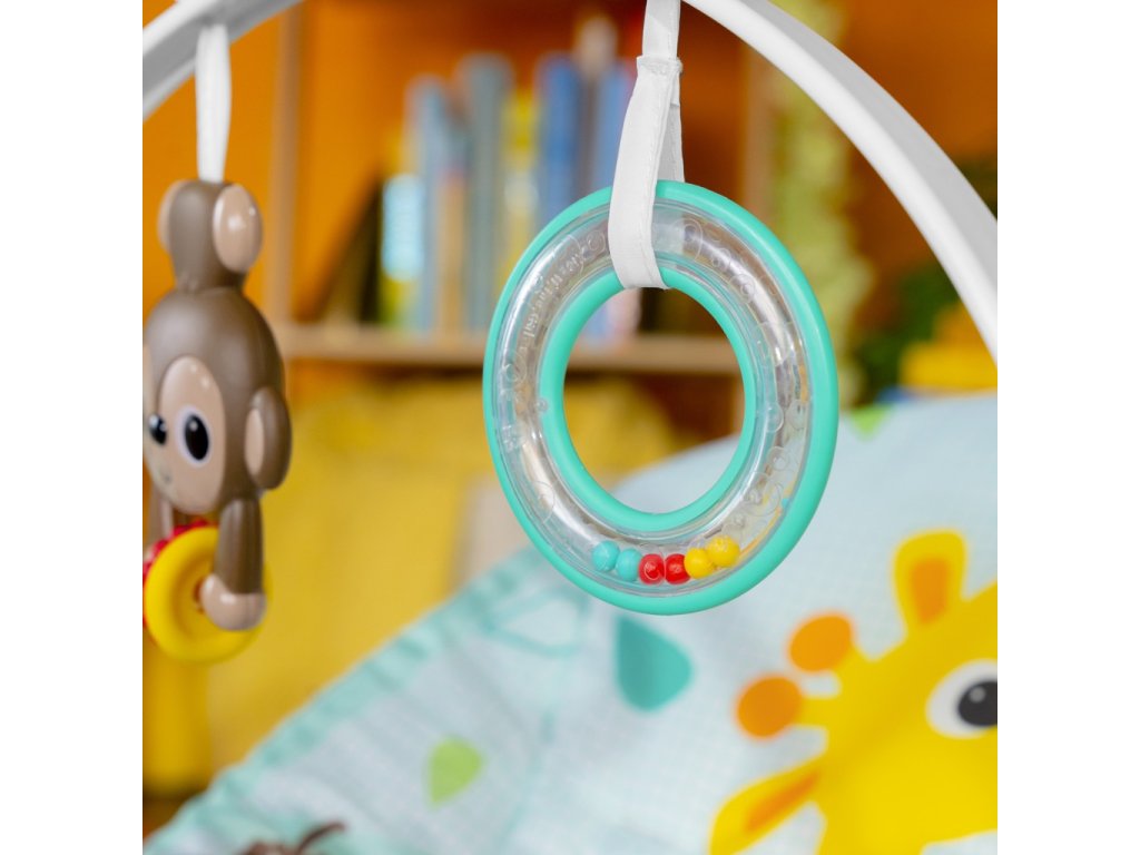 - Začněte si interaktivě hrát se zábavnou hrazdičkou s hračkami. Obsahuje barevné chrastítko a hračku na honění opičích korálků, které podporují dosahování, bouchání a jemnou motoriku. Odstraňte hrazdičku s hračkami, abyste mohli dítě snadno dostat dovnitř a ven.