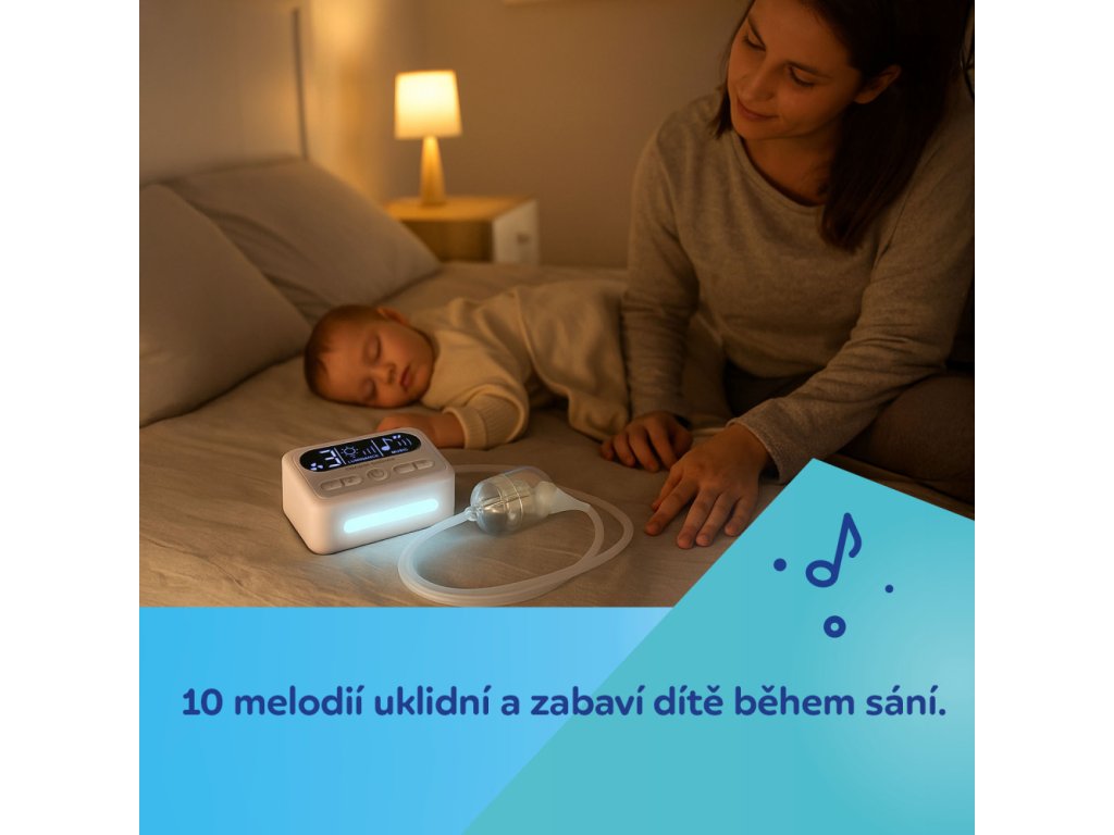 10 melodií uklidní a zabaví miminko během odsávání – 3 úrovně hlasitosti.