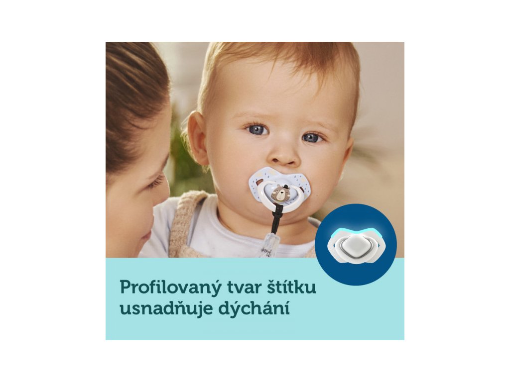 Speciálně profilovaný tvar plochého štítku - redukuje kontakt s obličejem dítěte a minimalizuje riziko podráždění.
