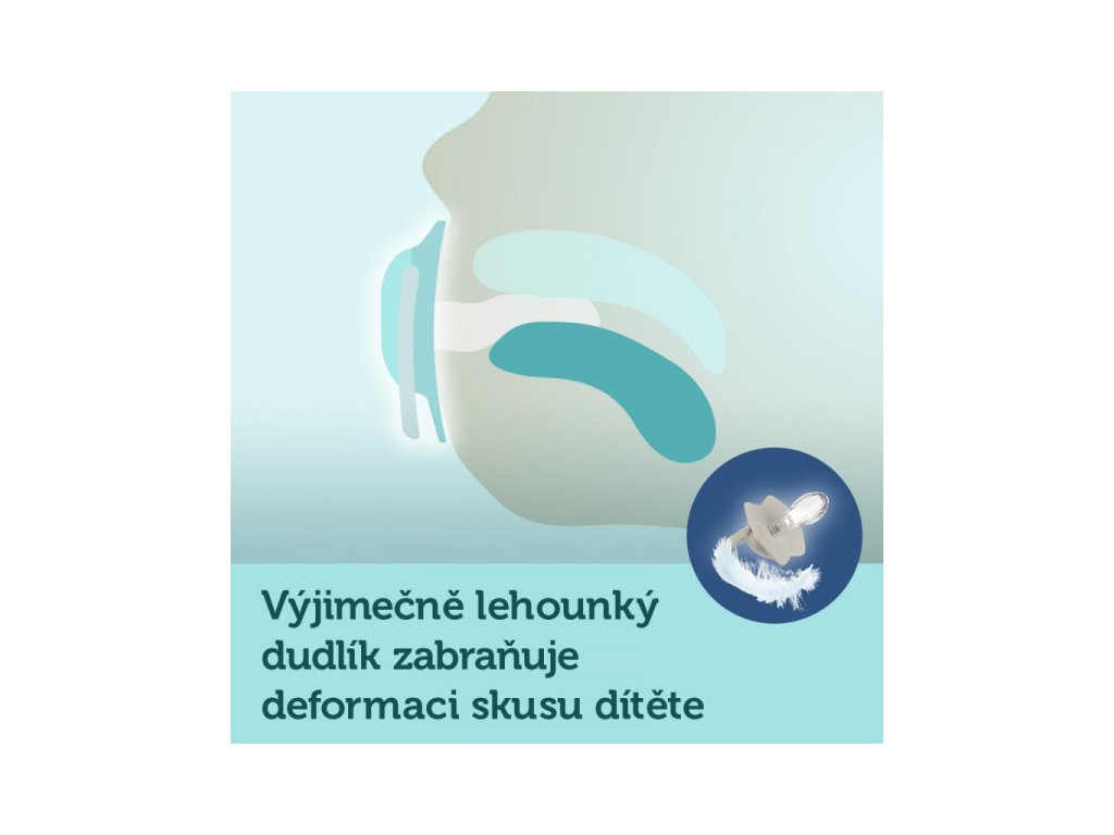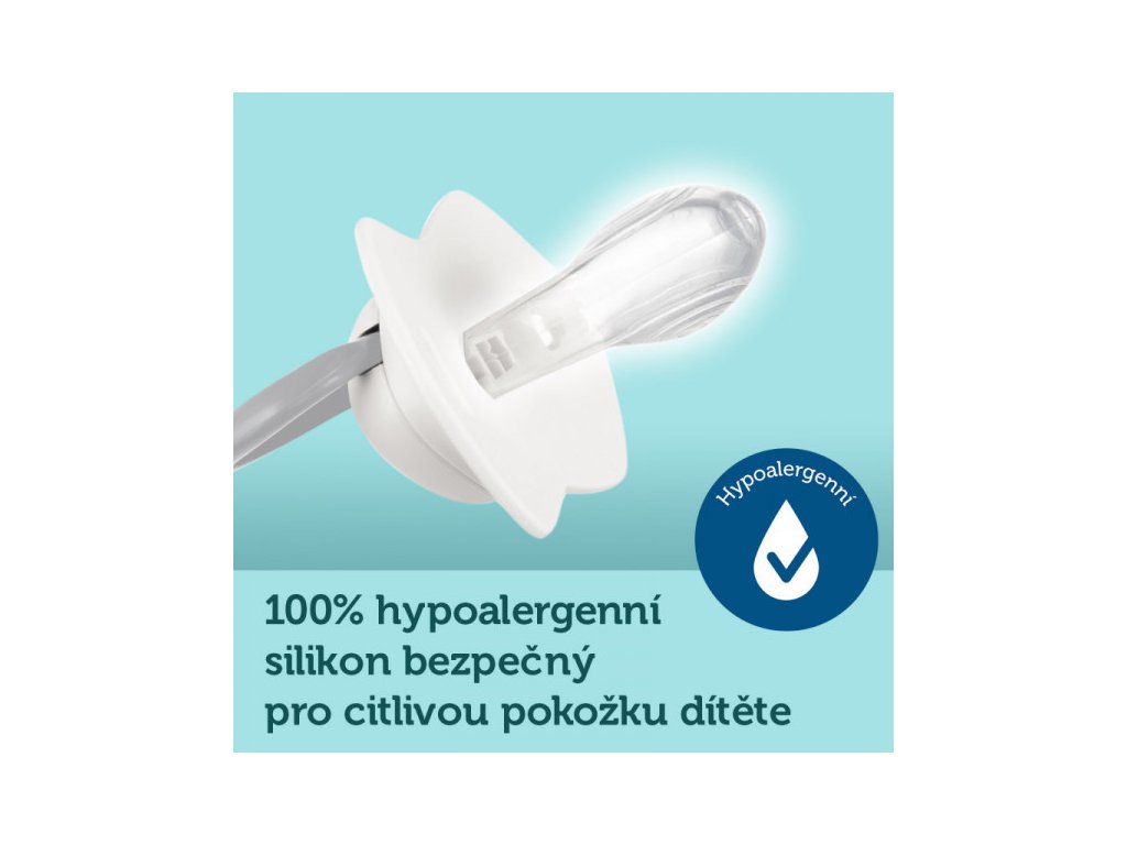 Gumička z měkkého silikonu je zcela transparentní. Vyžaduje menší úsilí při sání, takže rychle uklidňuje a zajišťuje pohodlí děťátka.