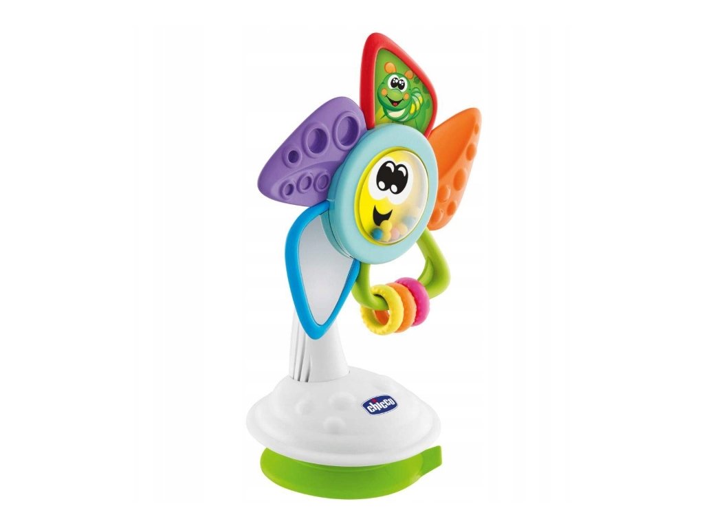 Hračka s přísavkou je ideální pro zabavení dítěte, které sedí v jídelní židli. Centrální panel ve tvaru kytičky se točí do kruhu a jednotlivé lupeny kytičky mají různý povrch. Hračka tak rozvíjí hmatové, vizuální a sluchové schopnosti dítěte.