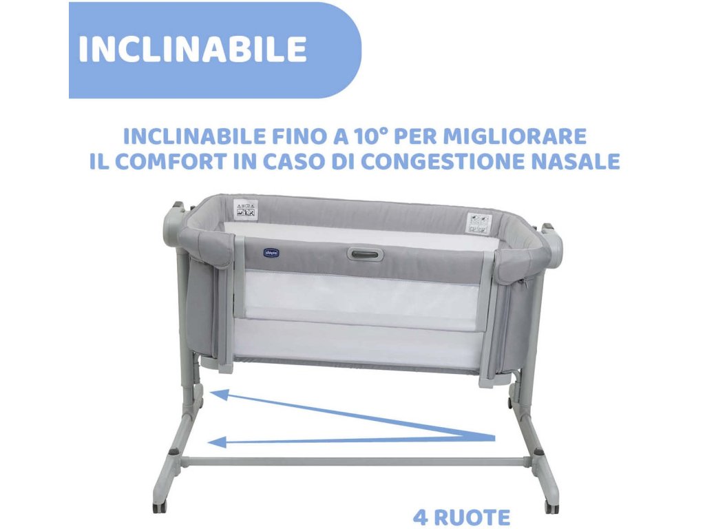 Dětskou postýlku lze naklonit až o 10° s maximálním počtem 4 nezávislých poloh mezi mezi pravou a levou nožičkou, což je ideální při problémech s refluxem nebo když má dítě ucpaný nos.