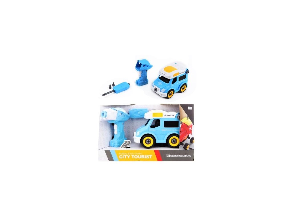 Šroubovací karavan na dálkové ovládání. Karavan lze sešroubovat pomocí přiloženého šroubováku nebo vrtačky. Z vrtačky lze vyndat motorek, který se vloží do karavanu a ten poté jezdí pomocí ovládání dopředu a dozadu. karavan také vydává zvuky. Napájení na 4 AA baterie (nejsou součástí) a na 3 AG13 baterie (jsou součástí). Rozměry karavanu cca 18 x 13,5 x 8,5 cm. Rozměry balení cca 33,5 x 19,5 x 13,5 cm. Věk 3+