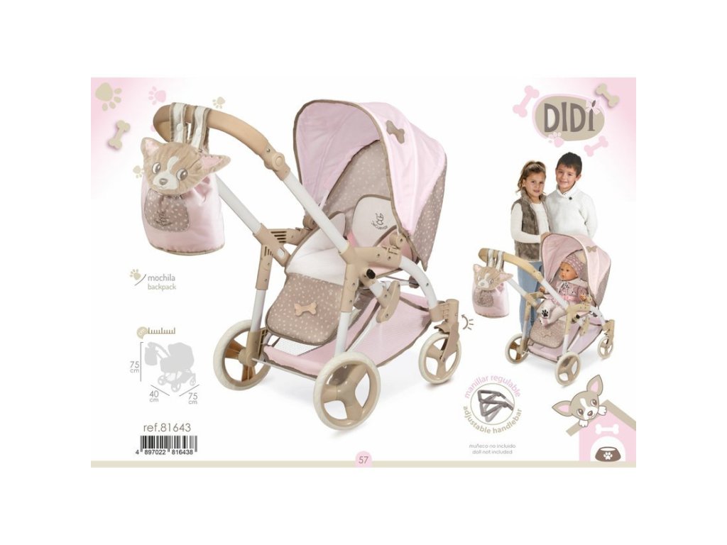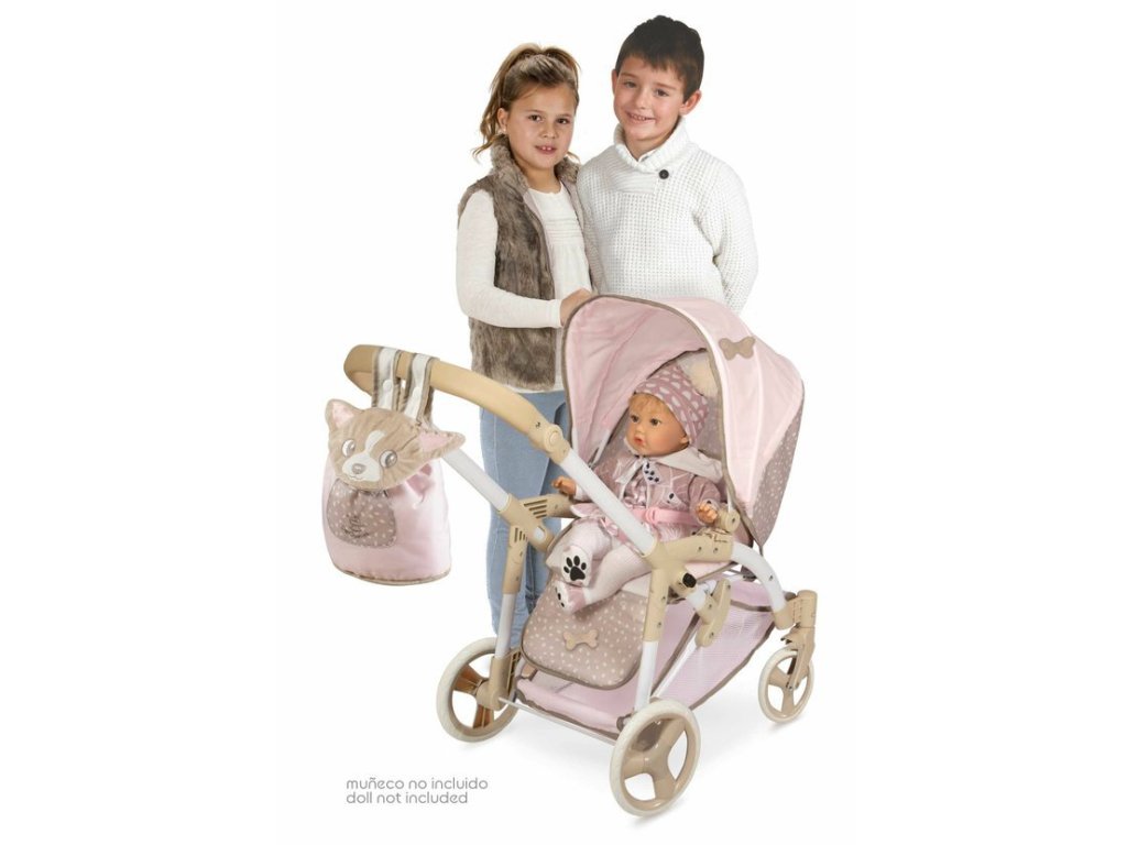 DeCuevas 81643 Skládací kočárek pro panenky 3 v 1 s přenosnou taškou DIDI 2021 - 75 cm, z doslova okouzlující, něžné, růžovo bílo hnědé kolekce s malým roztomilým štěňátkem DIDI, je díky polohovatelné vyšší rukojeti a funkčním doplňkům vhodný spíš pro slečny předškolního věku, které toto vše už více při hraní využijí. K jeho kouzelnému vzhledu přispívá i kombinace použitých běžných hladkých materiálů v kontrastu se sametovou výšivkou malého pejska čivavy a jinými sametovými doplňky. Nádherný španělský design, precizní zpracování. Skládací model, velmi snadná manipulace během samotné hry.