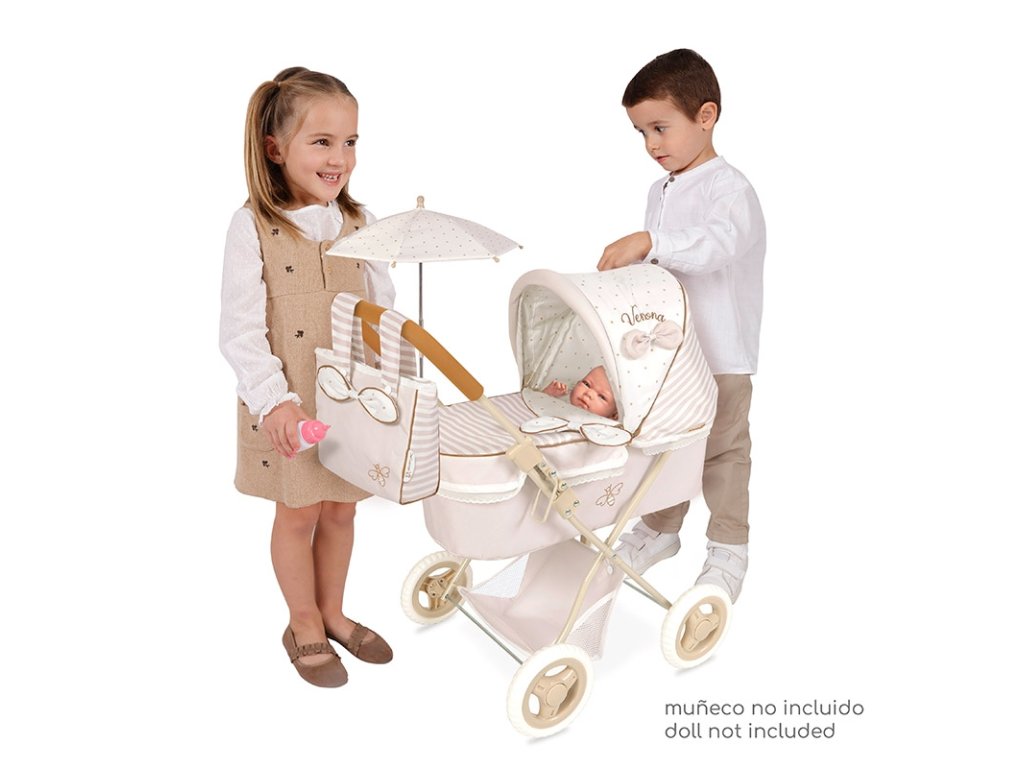 SDeCuevas 85078 Skládací kočárek pro panenky se slunečníkem a taškou Verona 2024 - 60 cm, ze stejnojmenné kolekce, která je novinkou roku 2024, je díky nízké rukojeti a lehké váze vhodný pro menší slečny. Kolekce nabízí nejen zmíněné kočárky, ale i jiné doplňky pro malé slečny a jejich panenky. Decentně laděná kolekce Verona je celá nesena v jemných pastelových přírodních barvách i vzorech. Kombinace světle béžové a bílé s roztomilými puntíky nebo proužky doplňuje světle hnědé úzké lemování, které zdůrazňuje dokonalost tvarů a krásně ladí s hnědými madly kočárků. Přírodní styl kolekce podtrhují aplikace mašliček zobrazující okvětní lístky a drobné výšivky včeliček.