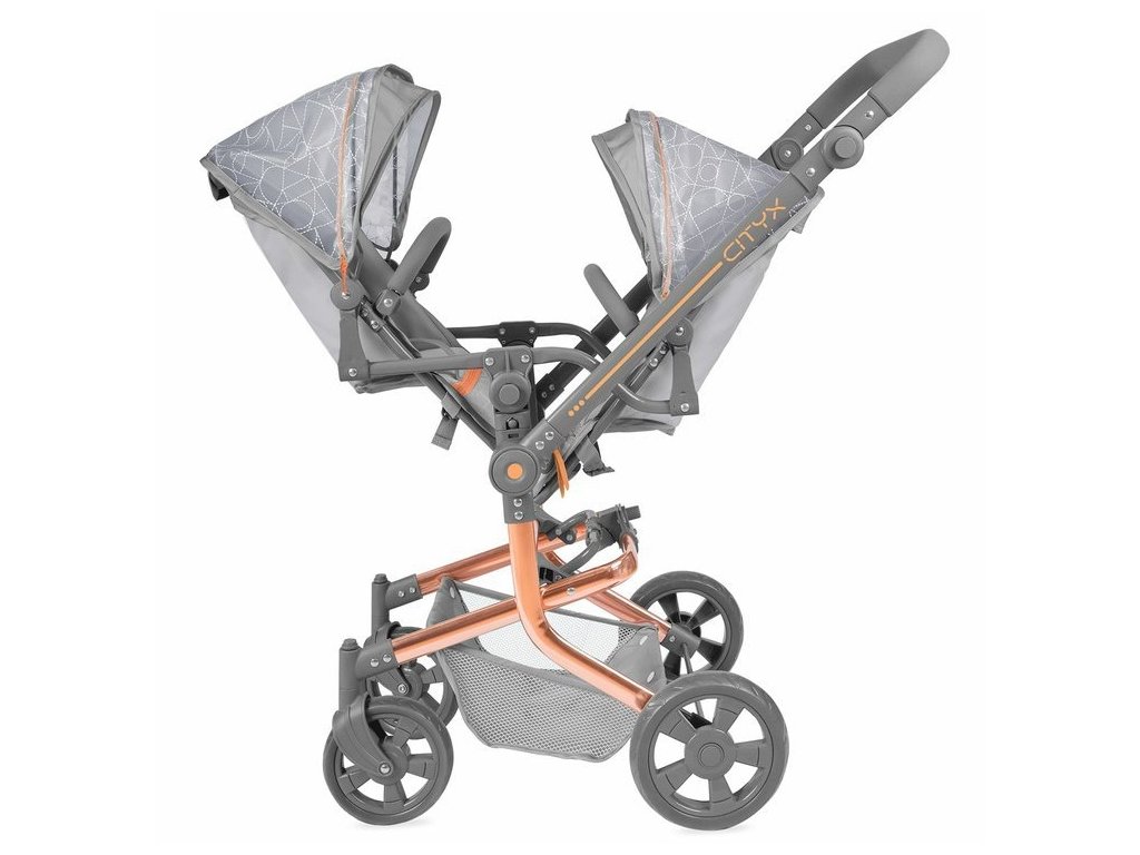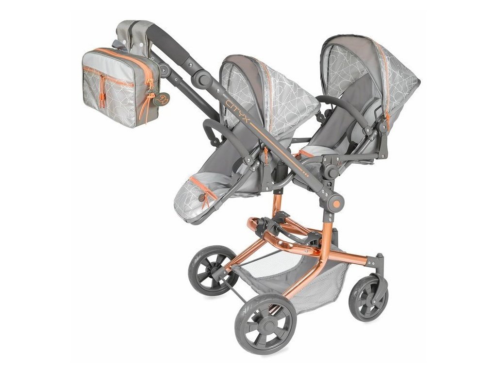 DeCuevas 90877 Skládací kočárek pro dvojčata panenky s batůžkem CITY X - 91 cm patří do stejnojmenné kolekce, která je novinkou roku 2024 a nabízí několik různých druhů kočárků. Supermoderní kolekce CITY X představuje kombinaci nevšedních materiálů. Standardní látky jsou doplněny o designově zpracovaný materiál PVC s potiskem, jež vytváří efekt skleněných ploch, které do dnešních moderních měst patří. Celou tuto stříbrošedou kolekci zdobí prvky v trendy měděné barvě, která podtrhuje lehkost a vzdušnost celé výjimečné kolekce.