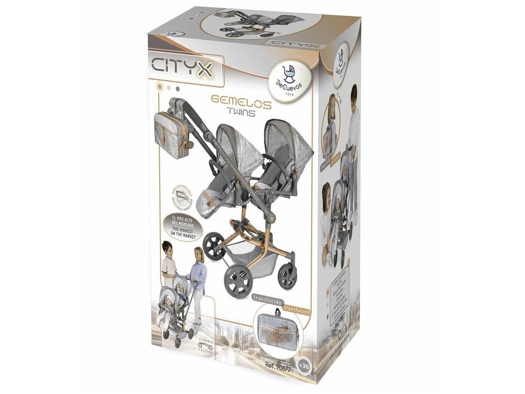 DeCuevas 90877 Skládací kočárek pro dvojčata panenky s batůžkem CITY X - 91 cm, je ze stejnojmenné kolekce, která je novinkou roku 2024. Tento sportovní kočárek je díky vyšší rukojeti a celkové velikosti spíš vhodný pro slečny předškolního věku, které toto vše už více při hraní využijí. Obdiv si tento kočárek právem zaslouží za svůj design, který dokonale kopíruje dnešní moderní reálné dětské kočárky celosvětově známých značek. Výhodou jsou i odnímatelné přenosné sportovní korbičky, ve kterých lze bezpečně přenášet panenky. Po složení nezabírá mnoho místa a je praktický i pro převoz autem. Tato supermoderní kolekce CITY X představuje kombinaci nevšedních materiálů. Standardní látky jsou doplněny o designově zpracovaný materiál PVC s potiskem, jež vytváří efekt skleněných ploch, které do dnešních moderních měst patří. Celou tuto stříbrošedou kolekci zdobí prvky v trendy měděné barvě, která podtrhuje lehkost a vzdušnost celé výjimečné kolekce. Kolekce CITY X nabízí několik různých druhů kočárků. Nádherný španělský design, precizní zpracování. Skládací model, velmi snadná manipulace během samotné hry. Materiál: kov (chrom a hliník), plast, textil. Baleno v krabici v barvách kolekce. Doporučený věk od 3 let.