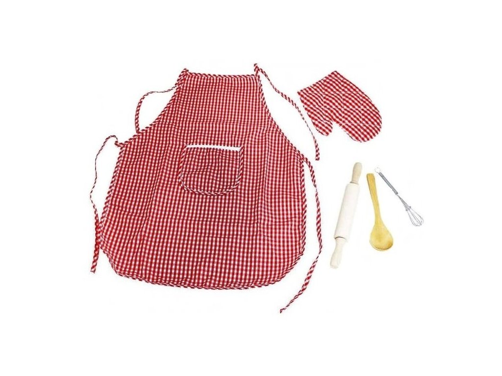 Kuchařský set obsahuje: dřevěný váleček na těsto o délce cca 20,5 cm, dřevěnou vařečku cca 14,5 cm, kovovou metličku cca 12,5 cm, chňapku 17x10cm a zástěru v.50 x š.40 cm (bez šňůrek).