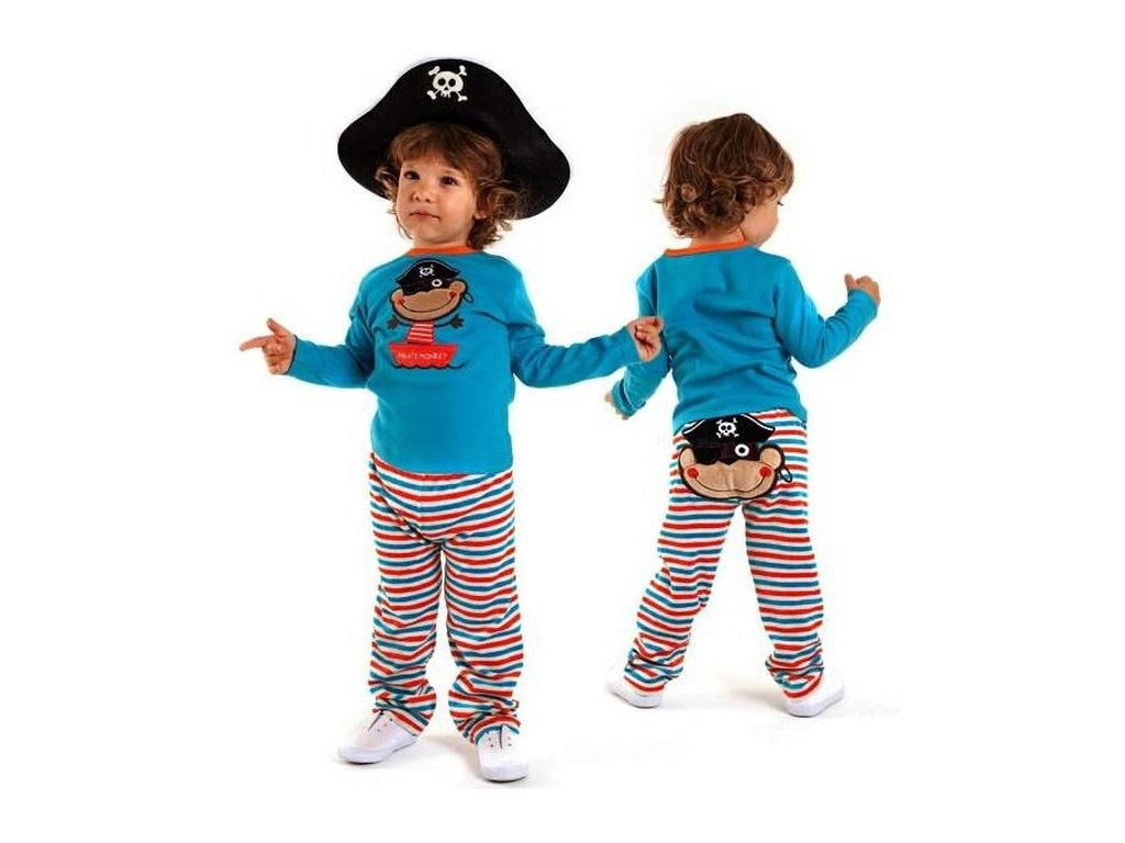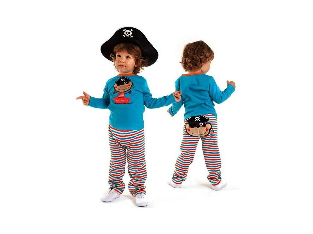 Designová dětská souprava - Triko s dlouhým rukávem s velkou nášivkou Opice piráta a kalhoty pruhované z česaného slabého bavlněného plyše.