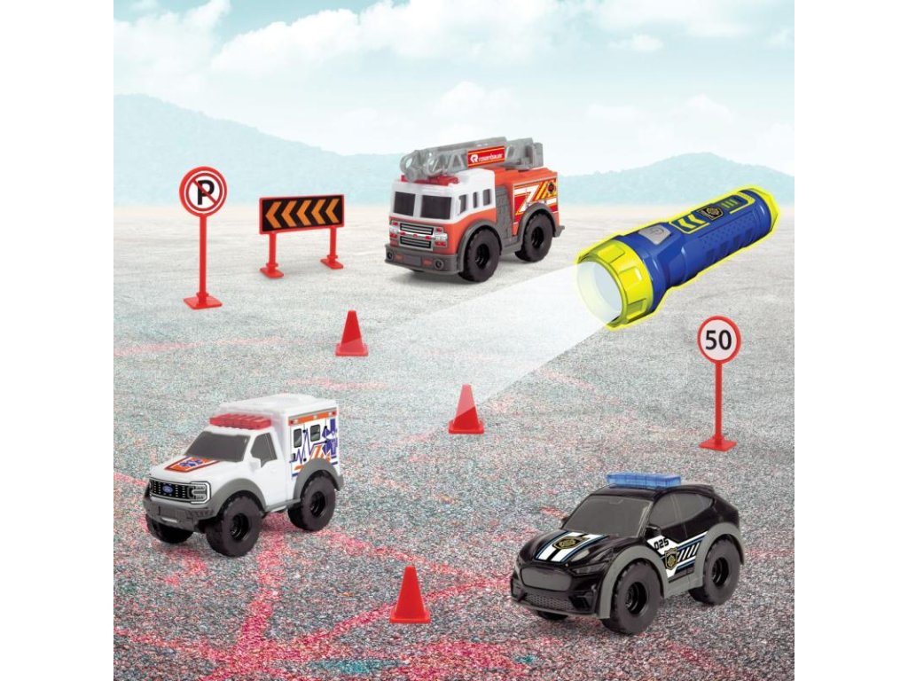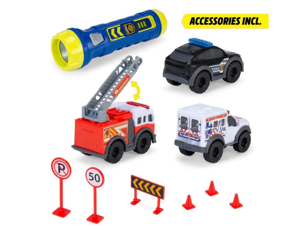 Set 3 ks mini dopravních záchranářských prostředků na volnoběh - hasičské auto, policie a ambulance. Součástí jsou dopravní značky a baterka, která má 3 světelné funkce,