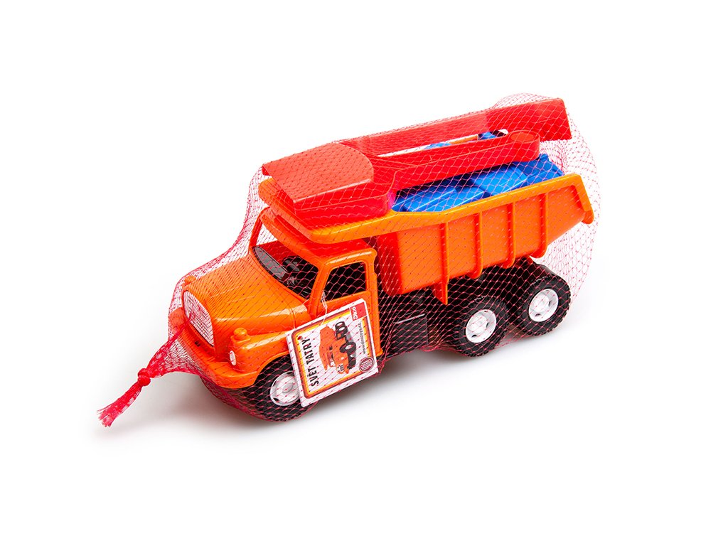 Pískový set obsahuje model oranžové Tatry 148 ve velikosti 30 cm, 2 bábovky, hrabičky a lopatku.