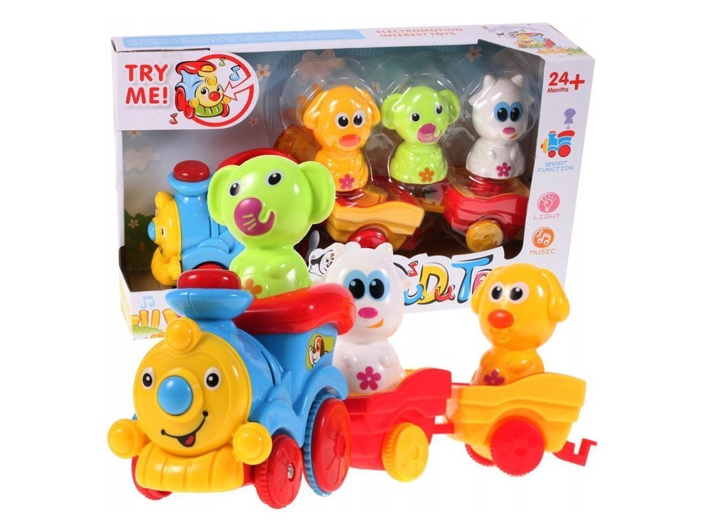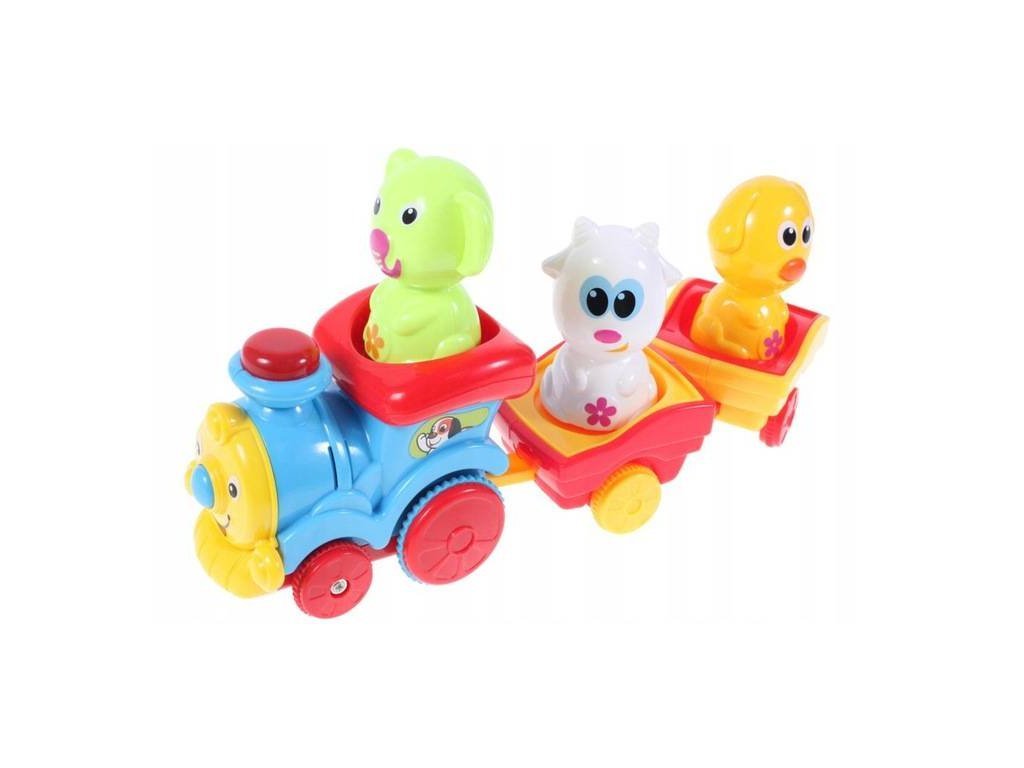 Plastový baby vláček se zvířátky. Vláček jezdí, houká, hraje, zvířátka se pohybují (když vláček jede), při zmáčknutí jednoho ze zvířátek můžete změnit rychlost jízdy vláčku.