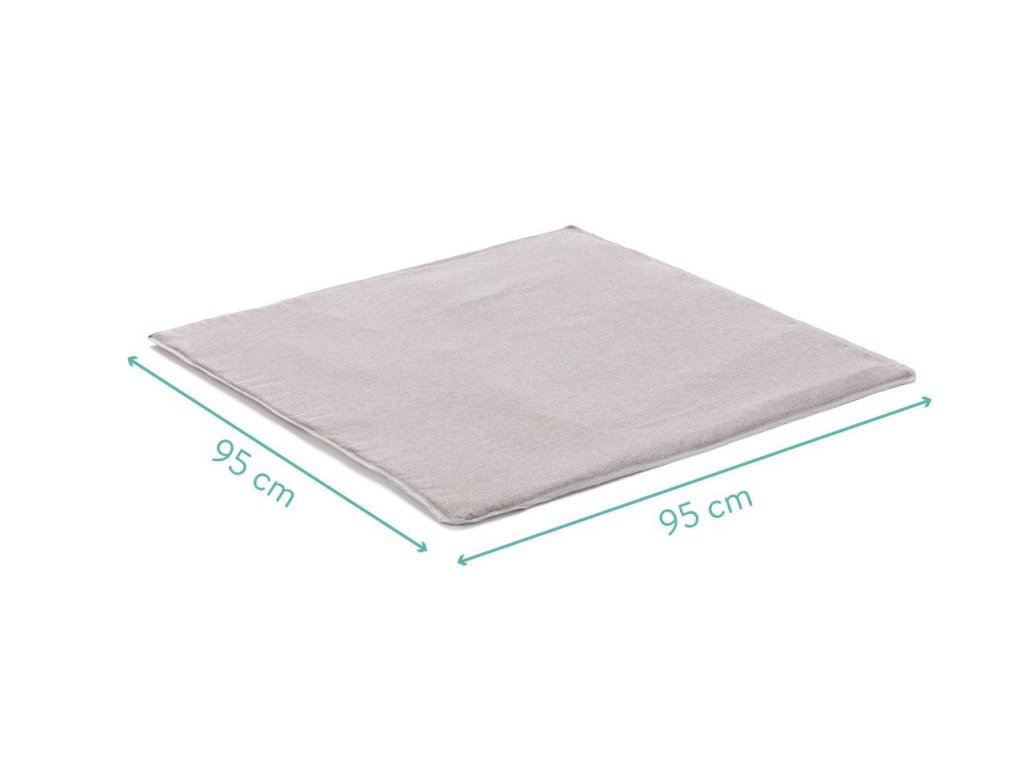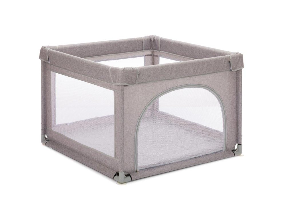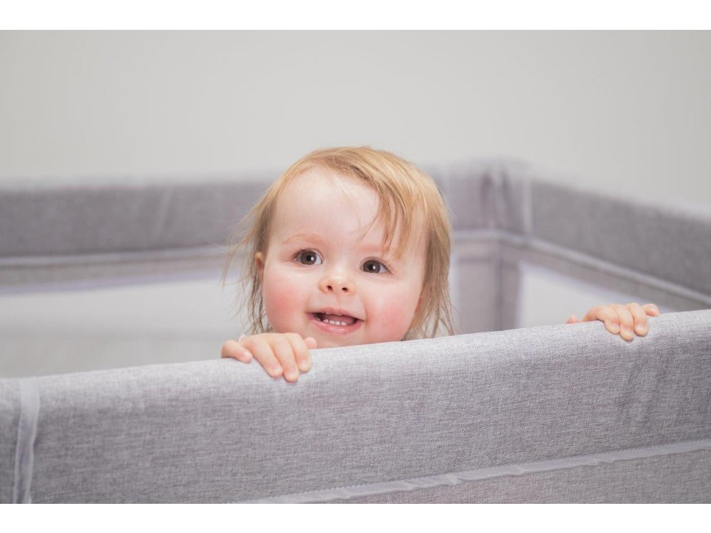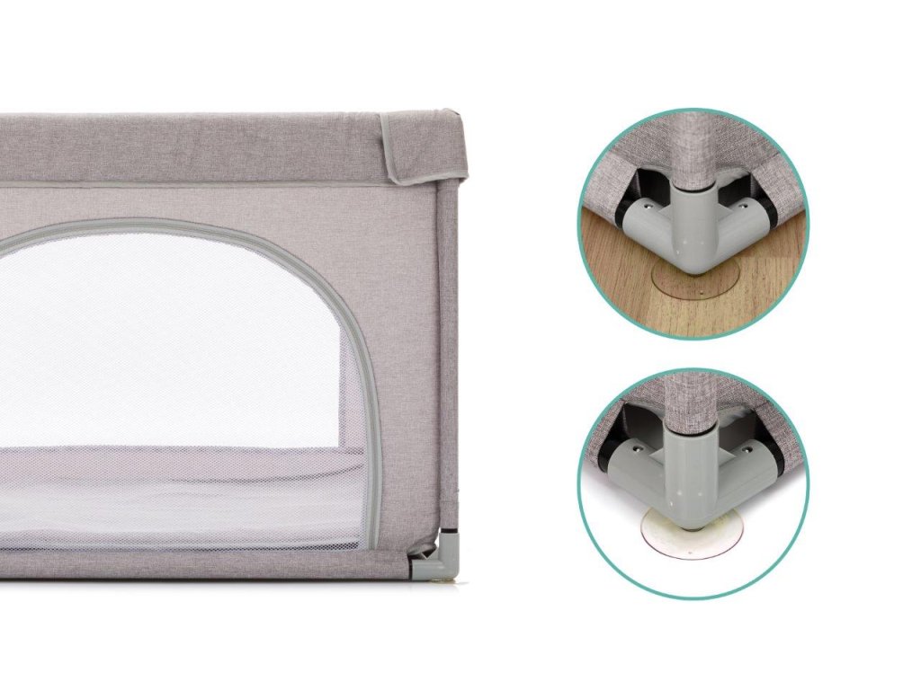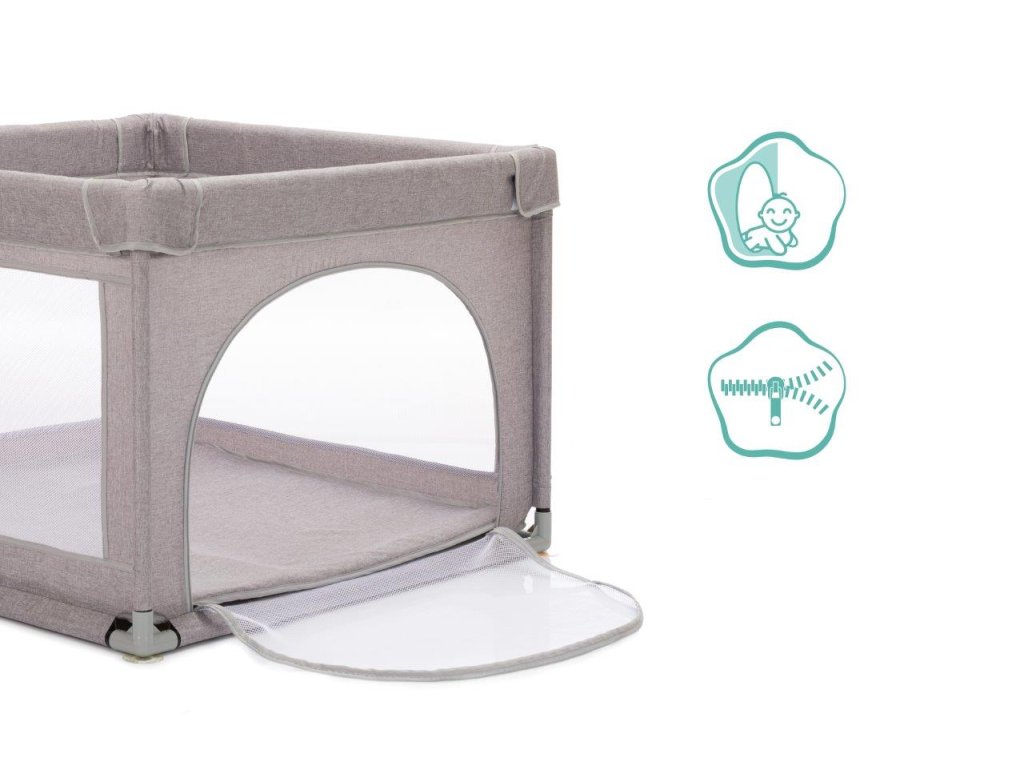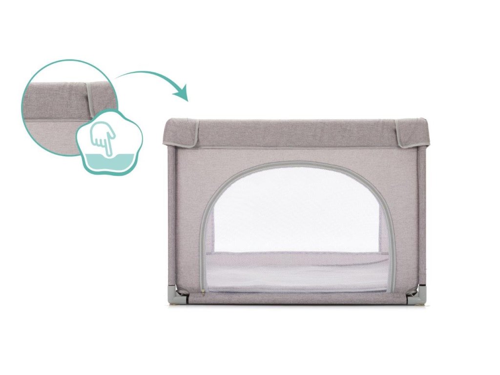 do místnosti. Vysoce kvalitní melanžový potah v jemné šedé barvě dokonale splyne s jakýmkoli obytným prostorem. S přiloženou taškou lze ohrádku Mia snadno přepravovat v rozloženém stavu.