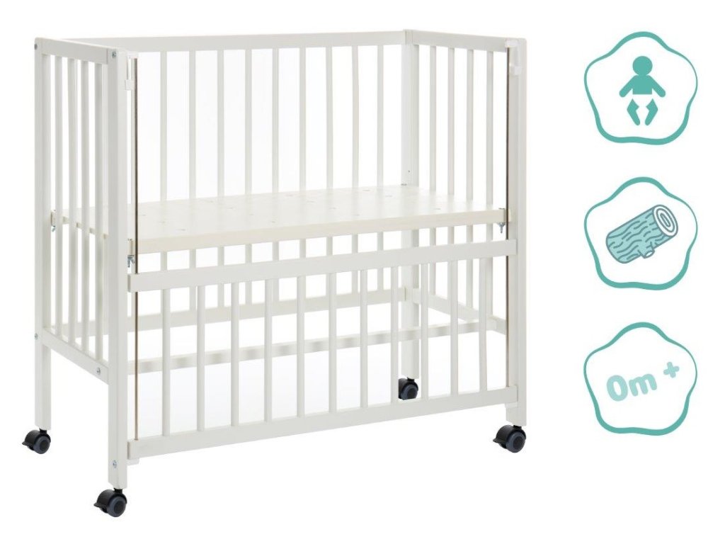 Dětská přístavná postýlka - k posteli, rozměry matrace 40 × 90 cm (Š×D), s kolečky, stahovací bok, rošt součástí balení, s polohovacím dnem, polohování bočnic, nosnost 15 kg.