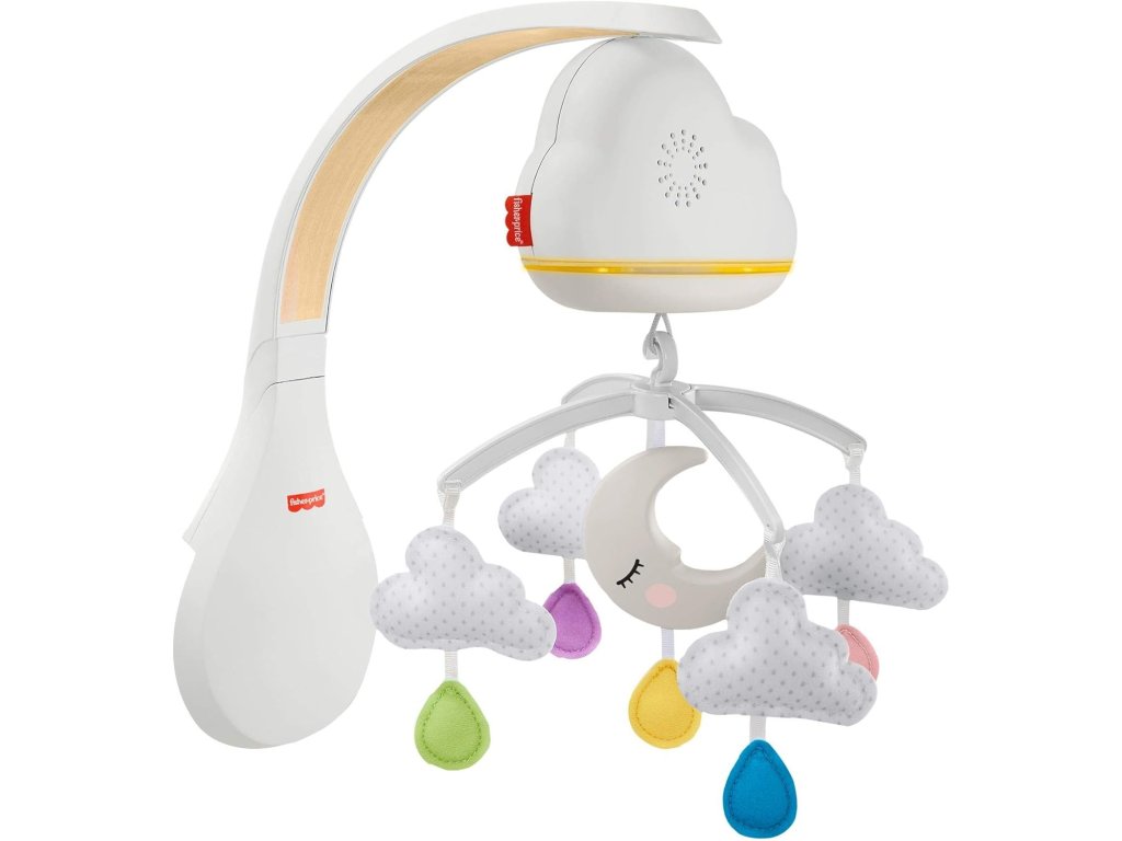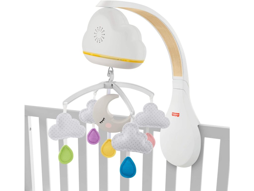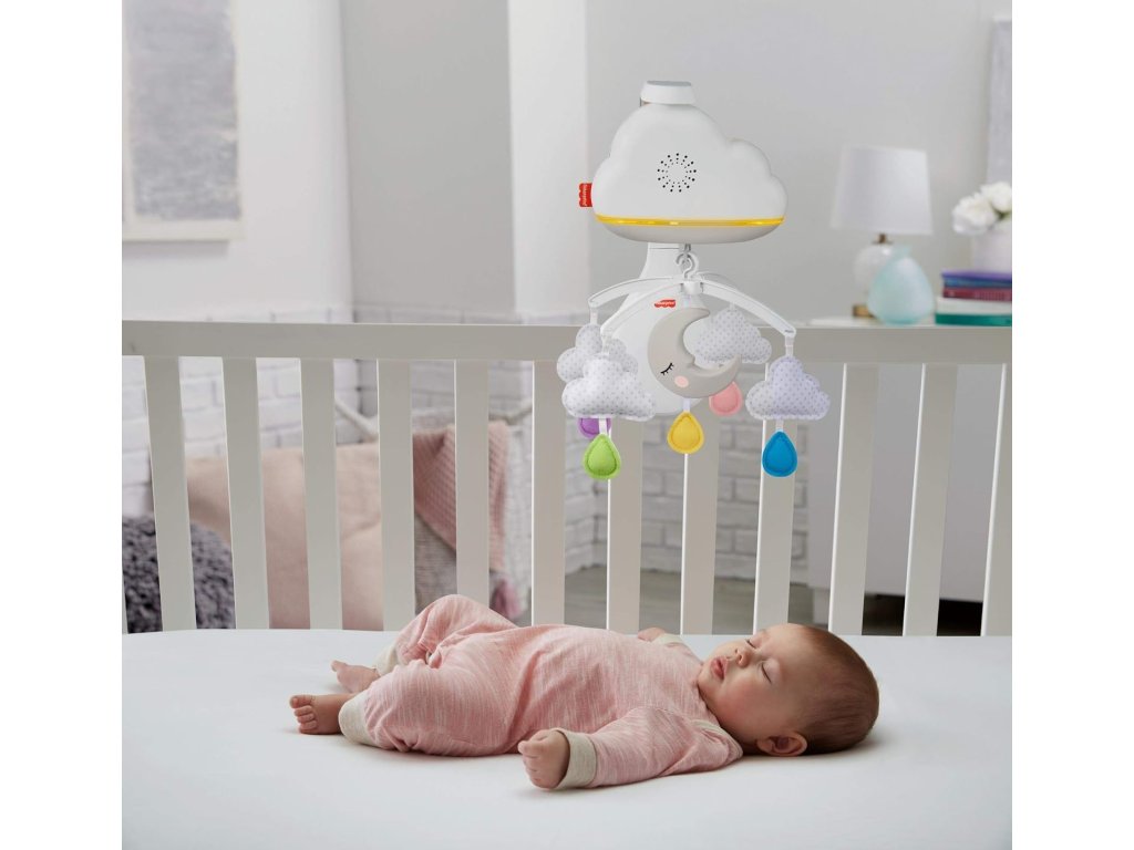 Kolotoč a usínáček Calming Clouds od Fisher-Price se vyznačuje elegantním designem s měkkými načechranými mráčky a barevnými „dešťovými kapkami“, které se otáčí nad hlavou děťátka, a doprovází ho jemná hudba a zvuky. S pohodlnou detekcí zvuku se mobil automaticky aktivuje, jakmile se vaše dítě v noci probudí. Pomáhá mu tak uklidnit ho zpět do spánku.