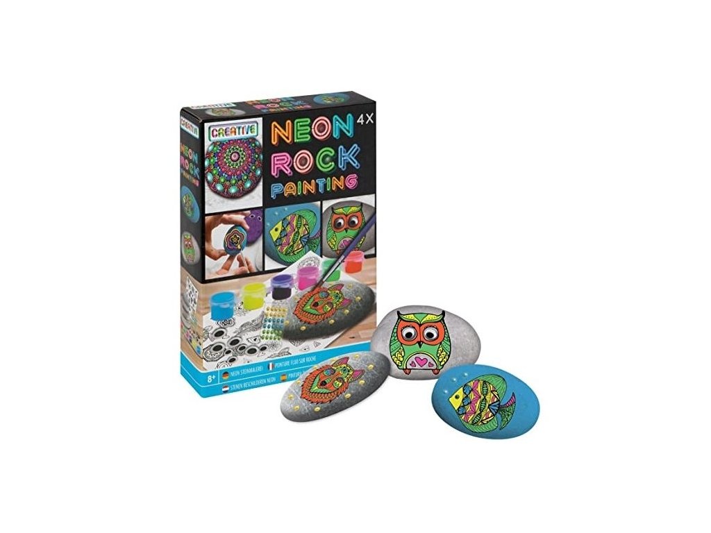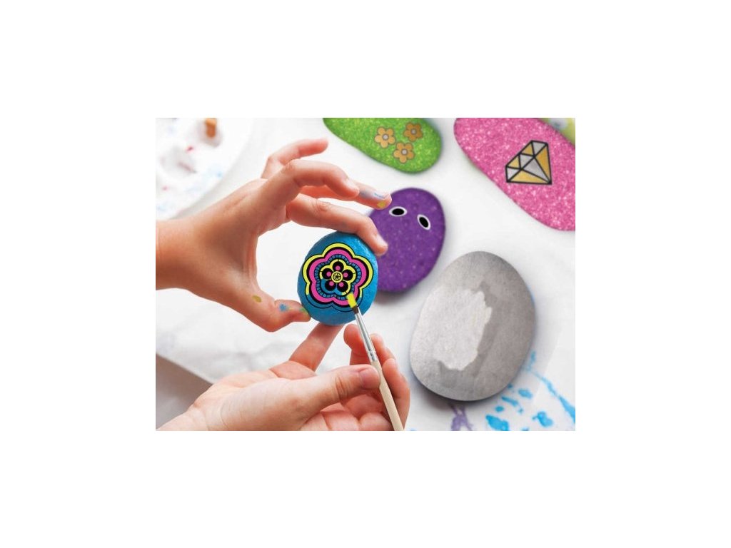 Sada na malování obsahuje 4 kameny, 6 neonových barev, 1 štětec, 1 dřevěná špejle, 1 arch s transfer samolepkami, 1 sáček s očima a nalepovacími korálky.