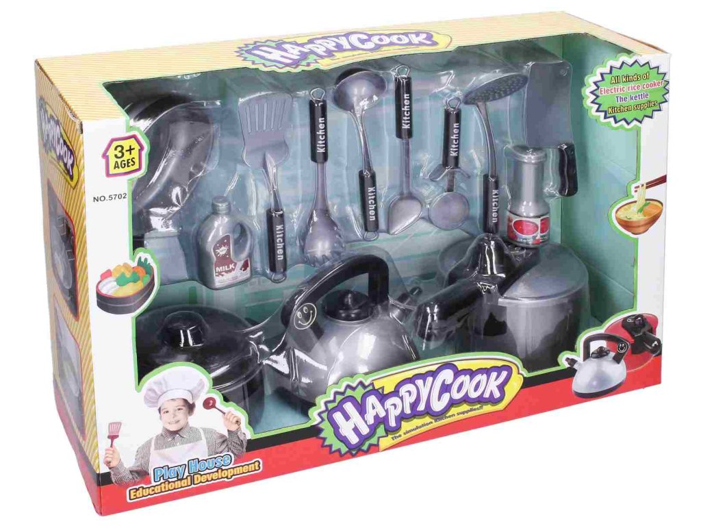 Kuchyňský set HappyCook. Pánvička, hrnec, konvička, tlakový hrnec, naběračky, nůž, kráječ pizzy, mléko, kečup, vajíčko.