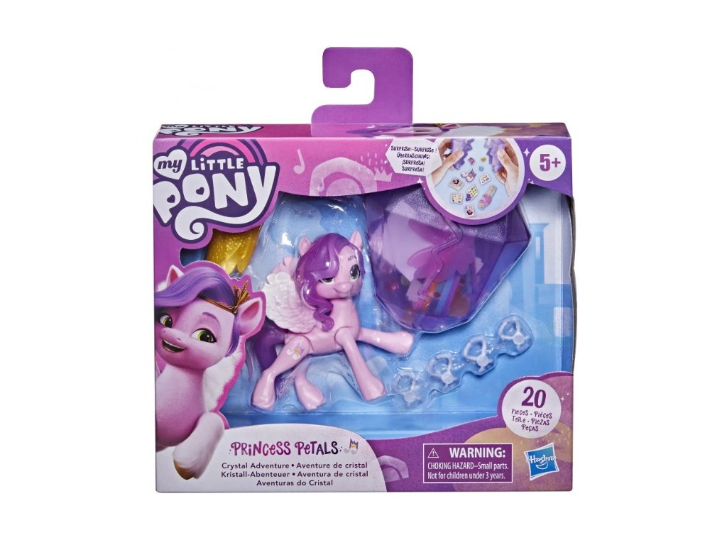 Princess Petals je stylová a talentovaná princezna popová hvězda. Rozlomte kouzlo překvapení s Crystal Adventure Princess Petals. Obsahuje kloubovou 3palcovou figurku růžového poníka princezny Petals s tvarovanými fialovými vlasy v jejím typickém vlnitém stylu. Figurka má na jedné straně notu inspirovanou postavou Cutie Mark. Rozbijte znovu použitelnou nádobu ve tvaru krystalu ve 2 a odhalte skrytý příběh a kousky přizpůsobení. Dodává se s archy nálepek a přívěsky pro zdobení poníka a jejích doplňků. Obsahuje náramek přátelství a dočasné tetování pro děti.