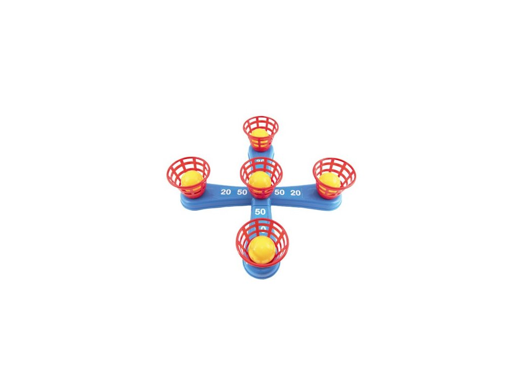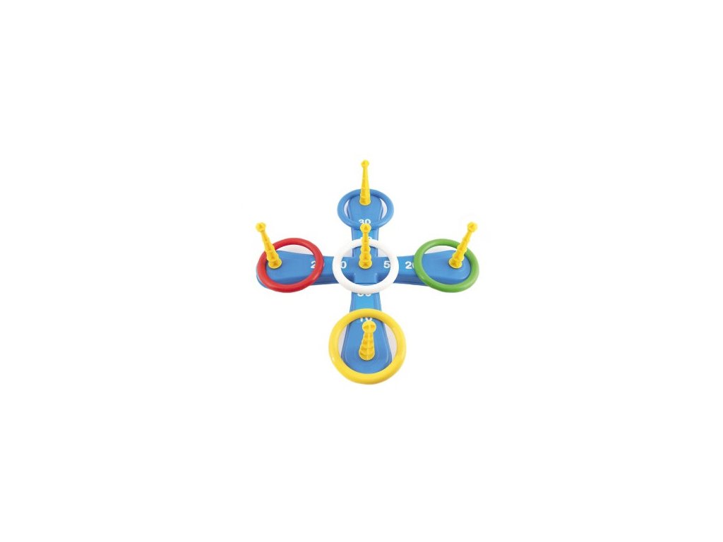 Zábavná hra, při které se hází kroužky na kříž. Balení obsahuje kříž s pěti hroty a pět barevných kroužků. Jednotlivé dílky jsou vyrobené z plastu. Tato hra se bude líbit zejména nejmenším dětem, které mohou sbírat body za každý hod, kdy se jim podaří umístit kroužek na hrot. Natrénují si také přesnost a trpělivost. Druhá hra funguje na stejný princip, ale hroty nahradily košíčky na míčky.