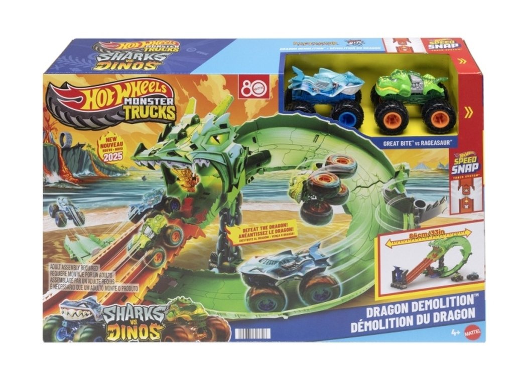 Závod začíná! Hot Wheels Monster Truck se utkávají v epickém souboji žraloci versus dinosauři, aby porazili svého úhlavního nepřítele – kybernetického draka v herním setu Dračí zkáza. Naložte oba přiložené monster trucky do dvojitého odpalovače a vystřelte je současně přímo do dračí tlamy. Čeká je divoká jízda skrz jeho tělo, kde rozhoduje motorová pila jako přeřazovač, který náhodně určí jeden ze tří výsledků – zadrží oba monster trucky, shodí jednoho z trati nebo propustí oba k vítězství. Jakmile drak padne, děti můžou znovu odstartovat útok a získat trofej!