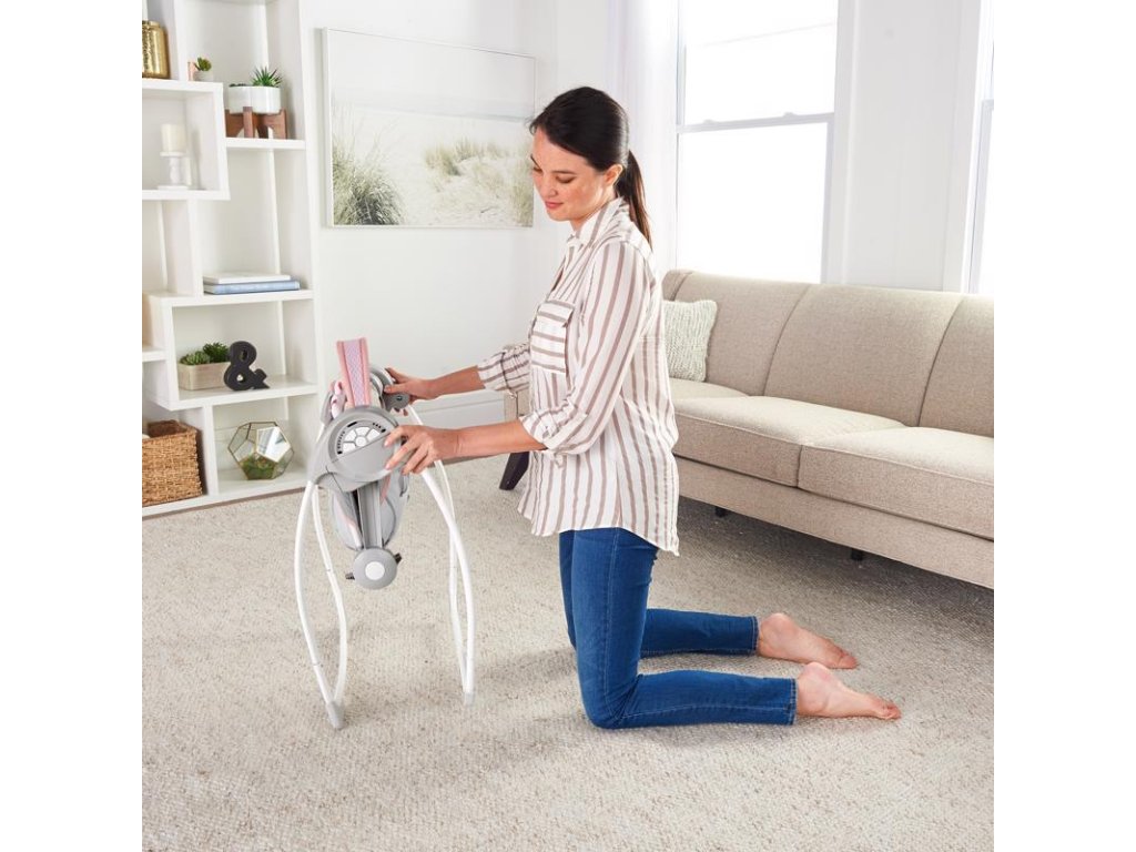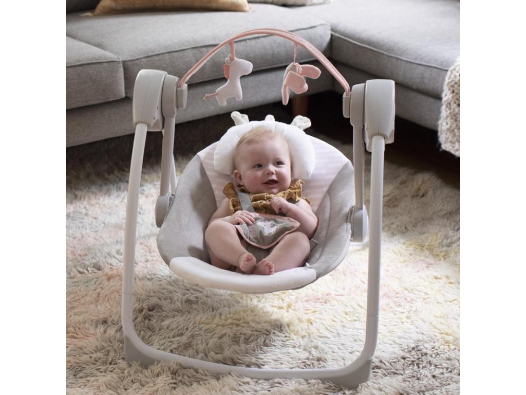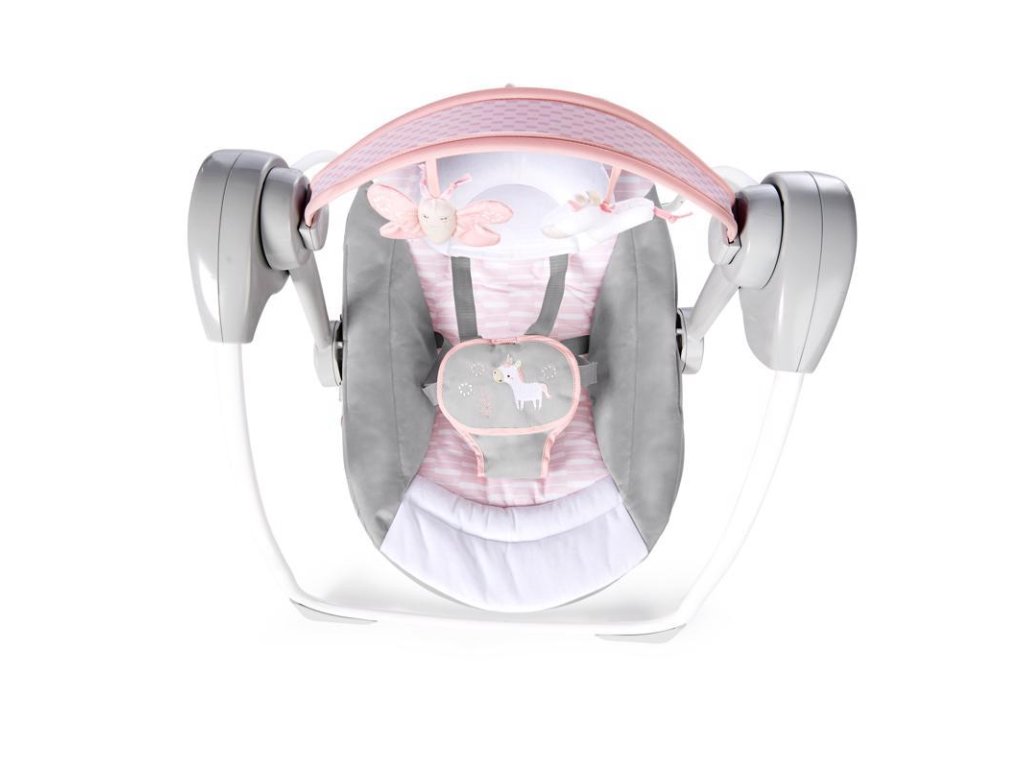 Navrženy s ohledem na rodičovství. Maximální pohodlí kdykoliv a kdekoliv s houpačkou Flora the Unicorn značky Ingenuity. Super kompaktní houpačka, která v sobě zachovává všechny nejdůležitější funkce velké houpačky. Tato lehká houpačka je vybavena množstvím funkcí včetně polohování sedáku do 2 poloh, hrazdičkou s 2 plyšovými hračkami, která se dá jednoduše odstranit pro snadný přístup k dítěti a technologií, která umocňuje uklidňující zážitek děťátka. Získejte pro sebe několik volných okamžiků díky časovači, který lze nastavit na 30, 45 nebo 60 minut. Uklidněte děťátko 12 melodiemi, z nichž všechny mají možnost nastavení hlasitosti. Houpačka je zabalena do dokonalých jemně ladících textilií. A i když se vám přihodí nějaká malá nehoda, tak opěrku hlavy a textilie sedací části můžete jednoduše vyprat v pračce. Sladký růžový design, hračky motýl a jednorožec, z ní dělají ideální houpačku pro holčičku. Používejte od 0 do 9 měsíců.
