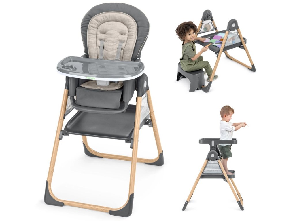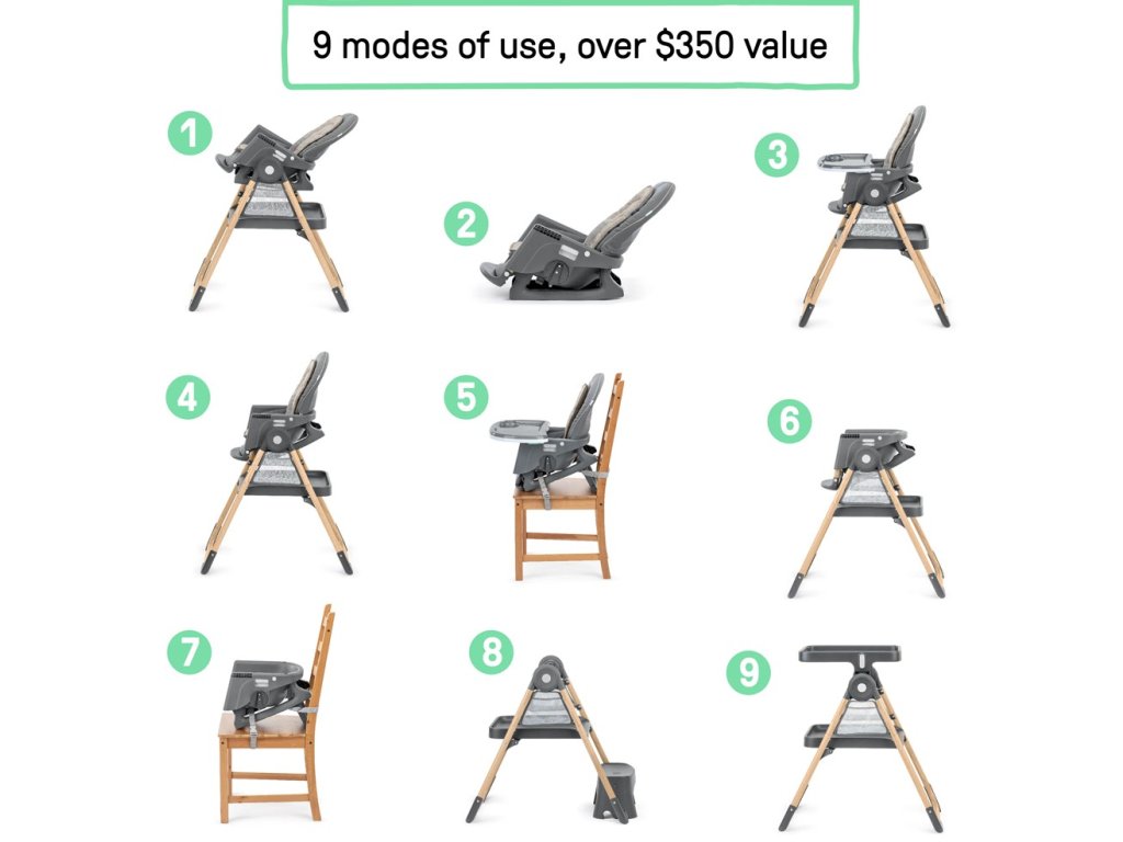- 9 režimů pro jedno dítě: plně sklopné křesílko, odnímatelné houpací křeslo, vysoká židle, židle ke stolu, přenosná židle na běžnou židli, židle pro batole, podsedák, učící/kuchyňská věž, kreativní stolek se židlí