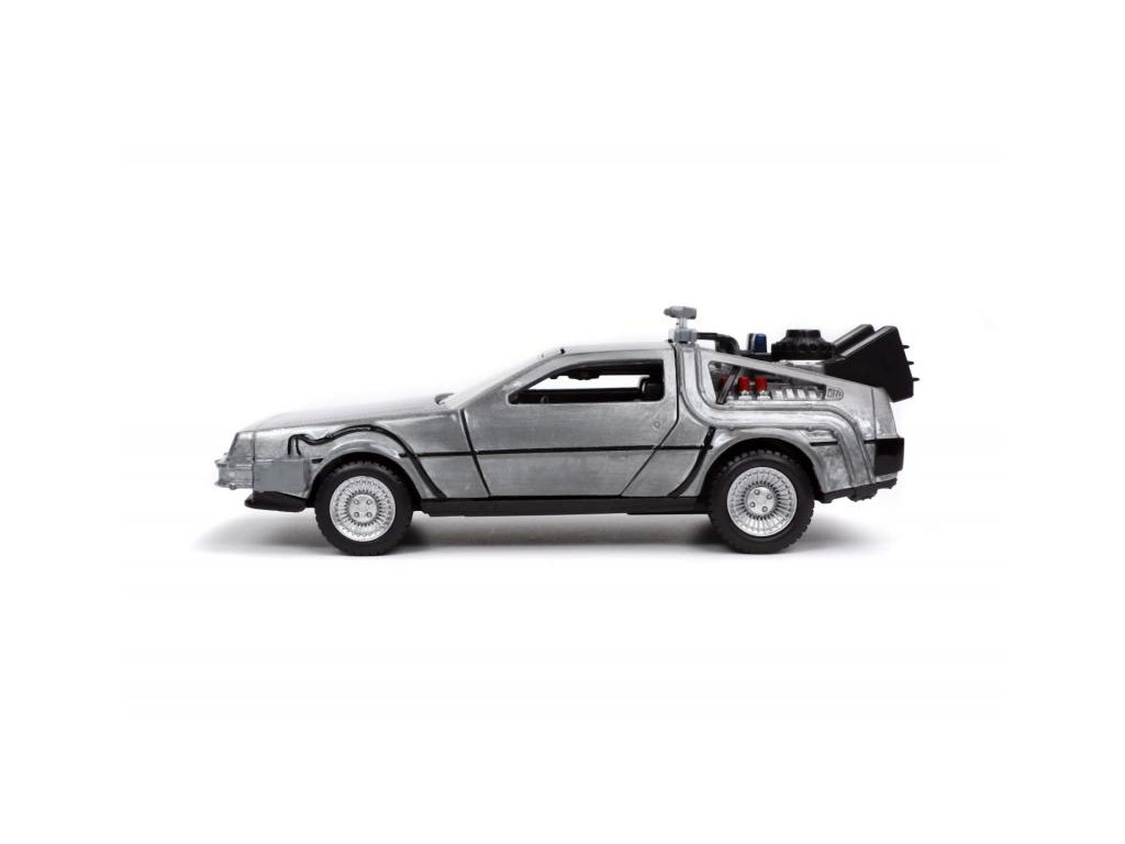 Kovový model Time Machine Back to the Future 1 na volnoběh v měřítku 1:32 s otevíracími dveřmi.