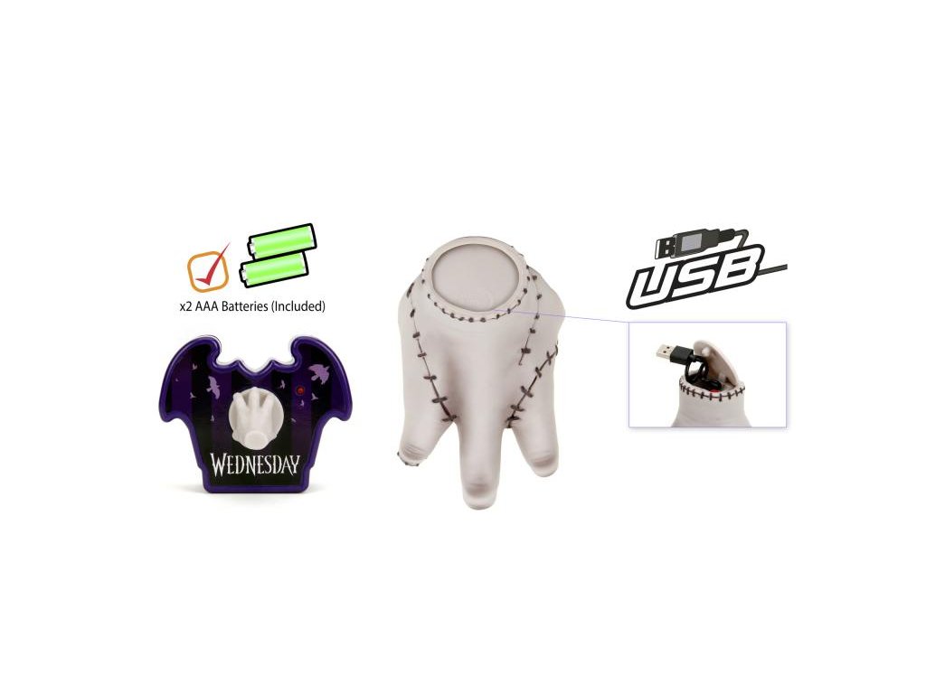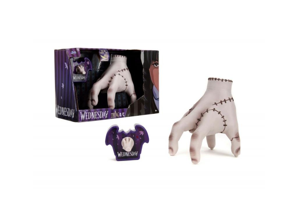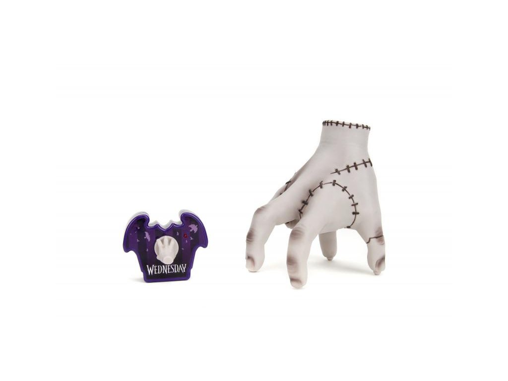 V balení je pohyblivá ruka z populárního filmu Wednesday - Ruka o výšce přibližně 18 cm. Součástí balení je také dálkové ovládání ve tvaru fialového netopýra s malou podobiznou ruky jako joystick. Stačí vložit baterie a stisknout horní část hračky, aby se začala pohybovat.