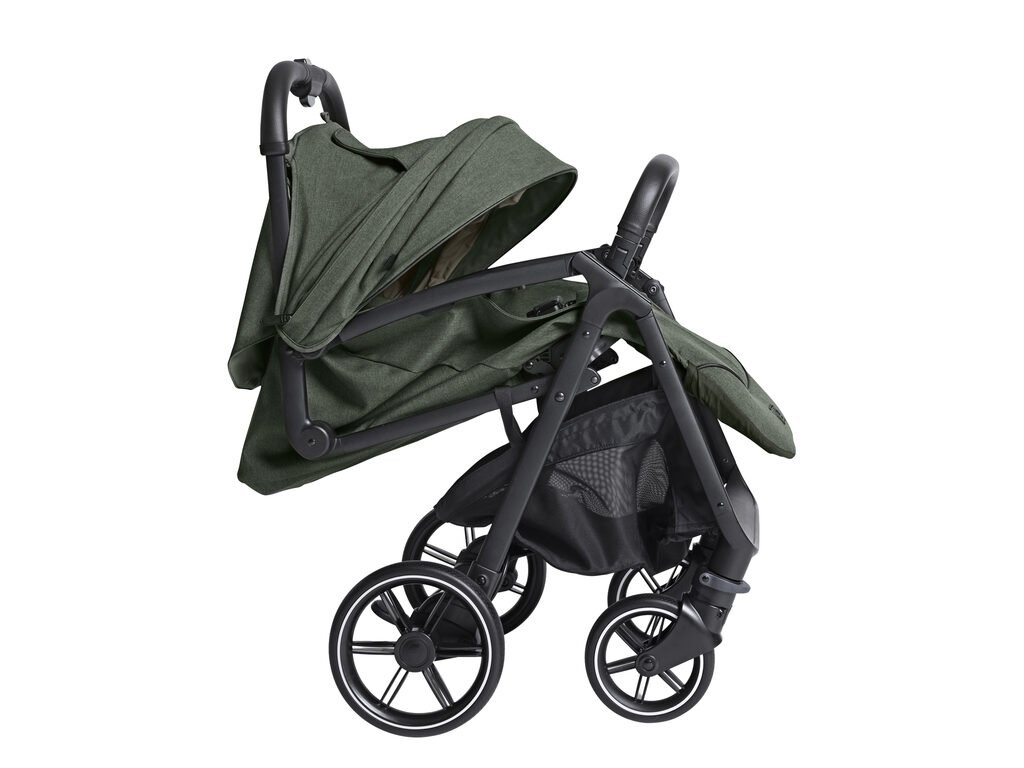 Skládání jednou rukou je rychlé a výsledný balík zůstane po složení samostatně stát. Nízká hmotnost usnadňuje manipulaci, přenášení i ukládání do auta. Součástí výbavy je také praktická taška pro snadný transport kočárku, pláštěnka a adaptéry pro nasazení autosedačky. Přední otočná kola s nadprůměrnými rozměry a spolehlivou aretací zvládnou i náročnější povrch a velký košík pohodlně pojme všechny potřebné věci.