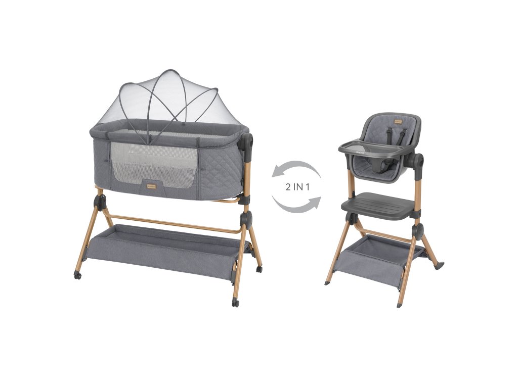 Postýlka a židlička 2v1 KikkaBoo Sleat Me nabízí praktické a stylové řešení pro rodiče, kteří hledají multifunkční vybavení s dlouhou životností. Postýlku pro miminko snadno přeměníte na jídelní židličku pro batole. Elegantní design s dřevěným vzhledem skvěle zapadne do každého interiéru.Postýlka (od narození do cca 6 měsíců, max. 9 kg):Funkce co-sleeping – postýlku lze bezpečně připevnit k posteli rodičůLehký hliníkový rám s dekorem dřevaVýškově nastavitelná do 3 polohMožnost nastavení náklonu proti refluxuSklopná bočnice pro snadný přístupSíťované panely pro lepší cirkulaci vzduchuPás pro upevnění k posteli rodičůMěkká pohodlná matrace4 kolečka s brzdami pro snadný přesunÚložný prostor na hračky a doplňkyMoskytiéra pro ochranu dítěte před hmyzemJídelní židlička (pro děti do 3 let / max. 15 kg):Vhodná pro děti, které již samostatně sedí5-bodový bezpečnostní pásJídelní pult s možností nastavení do dvou polohMěkká sedací podložka3 výškové polohyKošík na hračky a drobnostiRozměry postýlky: 60,5 × 102 × 87,5–91,5 cmHmotnost: 9,8 kgRozměry židličky: 68 × 57 × 103–107 cmHmotnost: 7,6 kgVhodné pro děti od narození do 3 let (max. 15 kg).Doplňkové parametry