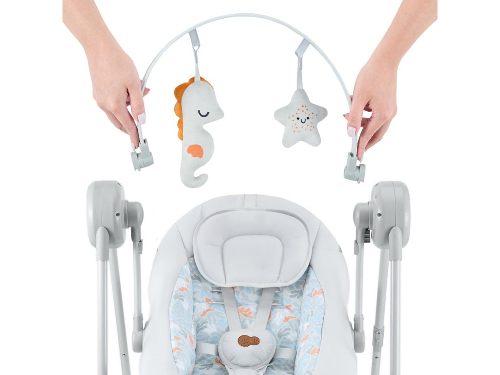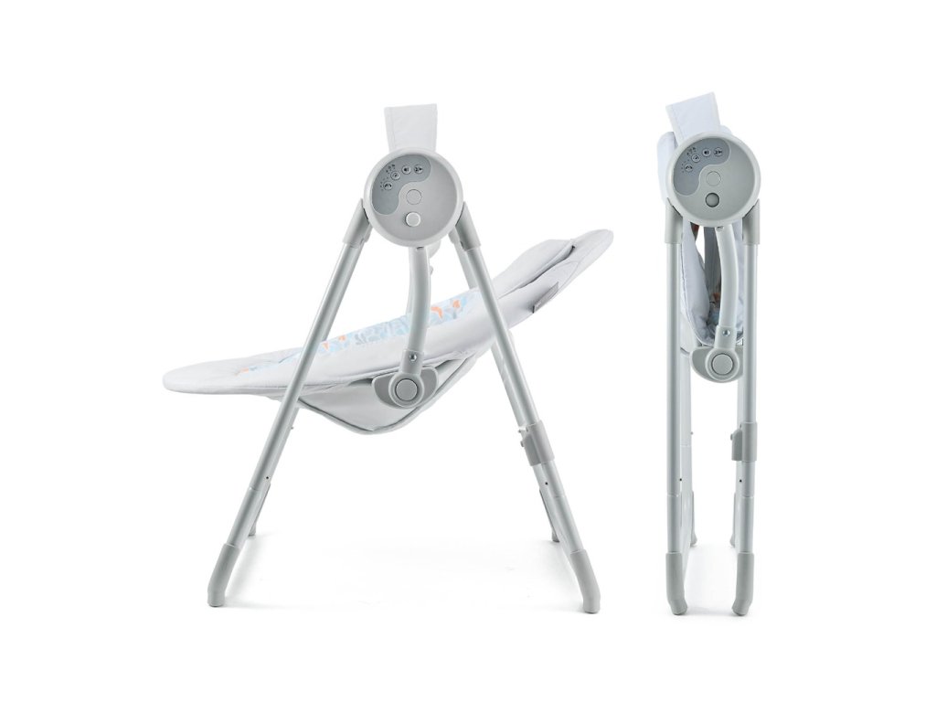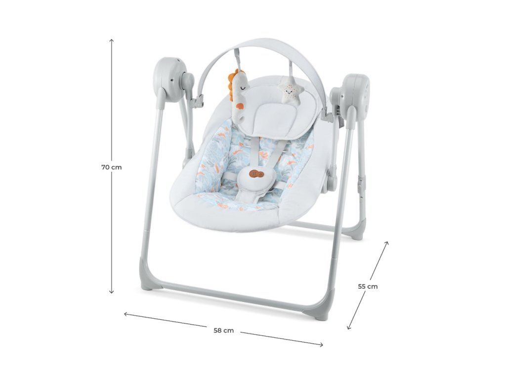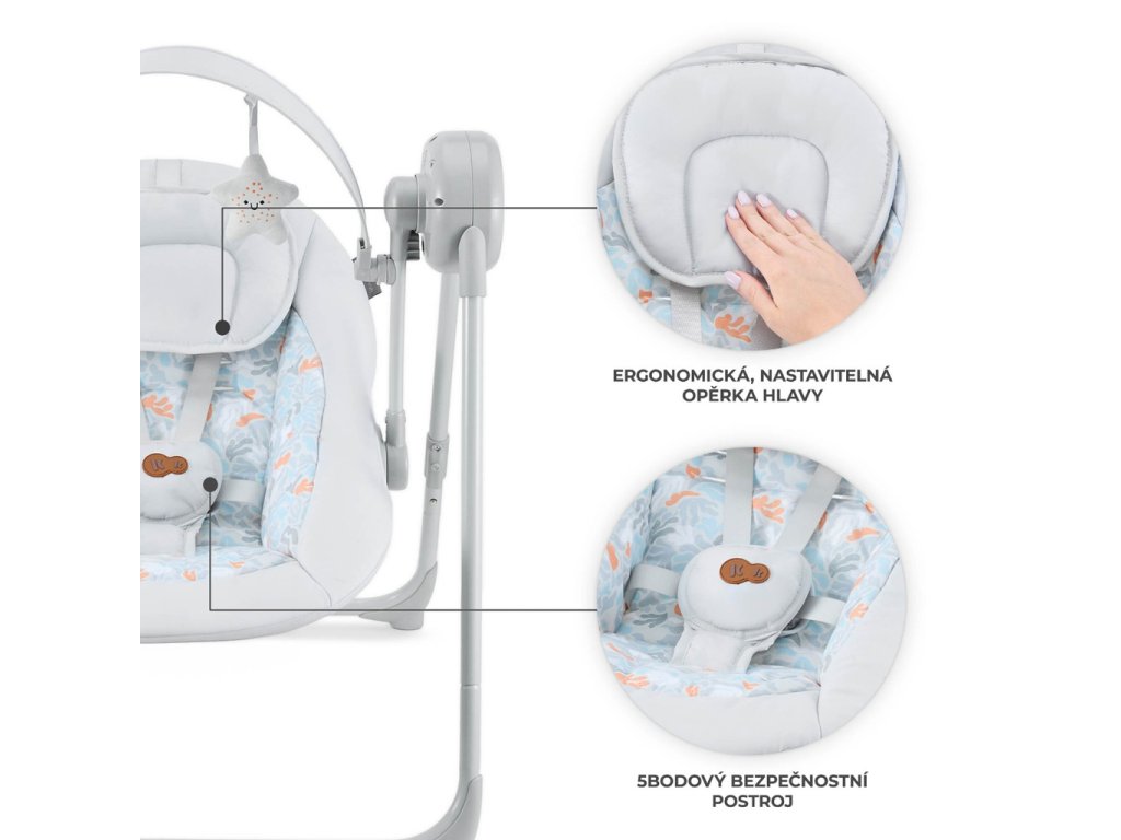 Houpačka s více funkcemi, které se přizpůsobí potřebám vašeho dítěte. SWINGEE nabízí pohodlí, bezpečnost a praktičnost v jednom lehkém a skládacím řešení. Využijete jej doma i na cestách, přičemž nabízí několik možností napájení – ze sítě, powerbanky nebo baterií. S 5 úrovněmi nastavení houpání a časovačem můžete snadno přizpůsobit pohyb podle nálady a potřeb dítěte. K dispozici máte také 8 uklidňujících melodií včetně zvuků přírody, které pomohou vašemu miminku lépe se uvolnit. Lehká konstrukce váží pouhých 3,7 kg a díky skládacímu systému je SWINGEE praktický pro uskladnění i přenášení. Pro maximální pohodlí je sedátko nastavitelné do dvou poloh – pro ležení a pololežení. Bezpečnost zajišťují 5-bodové pásy s měkkými návleky a ergonomický nastavitelný polštářek. Dvě měkké hračky na hrazdičce podporují rozvoj motoriky a stimulují dětské smysly.