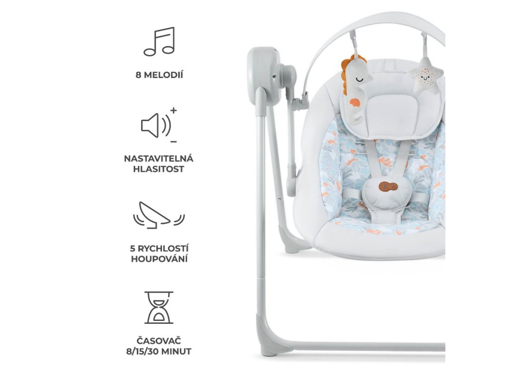 - 5 rychlostí houpání s časovačem (8, 15, 30 minut)