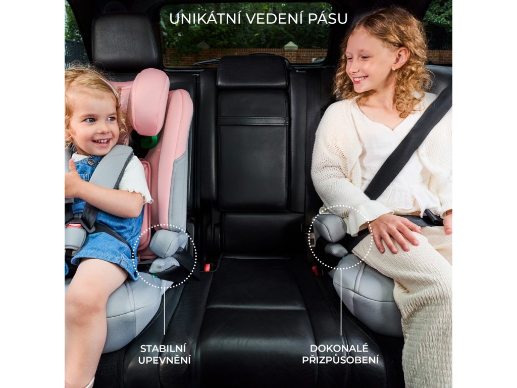 I-COMFY nabízí 10stupňové nastavení opěradla, které umožňuje přizpůsobit sklon opěradla sedačky úhlu sedadla v autě, a široké, pohodlné sedadlo s 5-bodovými bezpečnostními pásy vybavenými měkkými polstry a protiskluzovou vrstvou na ramenních popruzích. Od výšky 140 cm lze autosedačku používat i jako podsedák (booster).