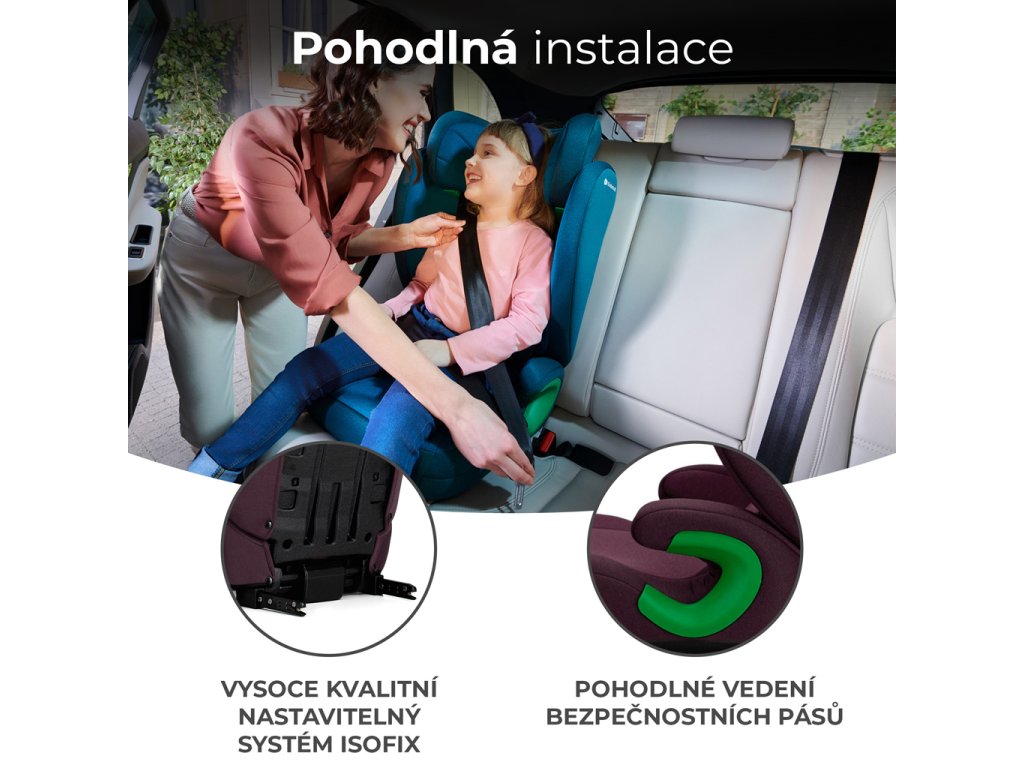 - Instalace pomocí systému ISOFIX a tříbodového bezpečnostního pásu.