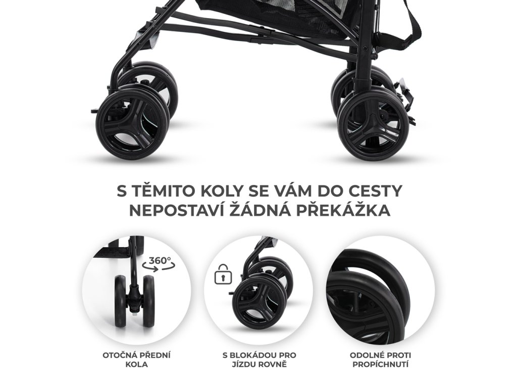 Kolečka kočárku jsou lehká a odolná proti propíchnutí - a nemusíte je ani nafukovat. Skvěle se hodí pro dovolenou typu city-break, odpočinek v rekreačním středisku nebo procházky po městě. Přední kolečka můžete zablokovat pro jízdu na nerovném povrchu.