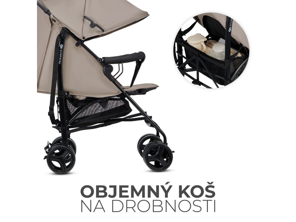 Pod sedačkou se nachází prostorný košík s nosností až 2 kg. Vejde se do něj drobný nákup i příslušenství, jako jsou vlhčené ubrousky, pleny nebo hračky.