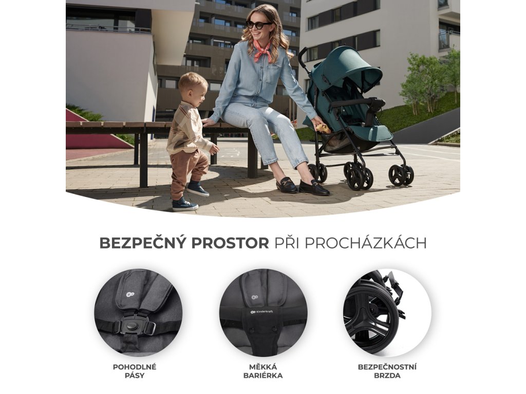 Deštník TIK je vybaven 5-bodovými nastavitelnými pásy a plnou měkkou bezpečnostní zábranou, která vytváří bezpečný prostor k sezení. Pásy můžete snadno nastavit tak, aby vyhovovaly vašemu rostoucímu dítěti, a díky chráničům si můžete být jisti, že vaše děťátko nebudou tlačit. Kočárek TIK je navíc vybaven dvěma brzdami na zadních kolečkách - jednoduše použijte jednu z nich k bezpečnému zablokování kočárku.